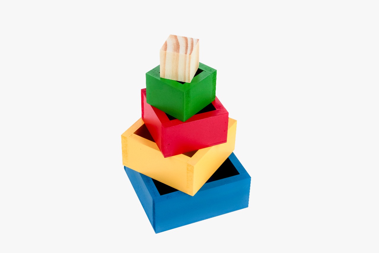 Confeccionada em M.D.F. e madeira - 4 peças coloridas pintadas com tinta esmalte sintético atóxico nas cores vermelho, verde, amarelo e azul, mais 1 peça de madeira crua.Medidas das peças variando de 3 x 3 cm a 11, 5 x 11, 5 x 4,5 cm.
