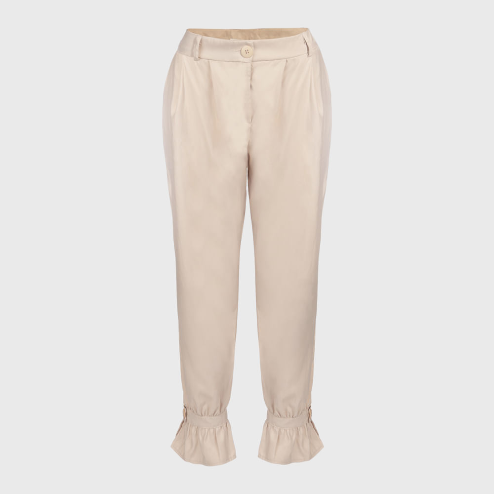 A calça com barra bufante pode ser<br>usada de duas formas com o botão aberto ou com botão fechado dando o efeito bufante. O detalhe que carrega um mood mais romântico está circulando nos looks de street style das brasileiras mais antenadas do momento. Inclusive, a peça é uma das favoritas para compor as produções com uma pegada mais fashionista. <br>O Modelo é mais soltinho ao corpo com tecido leve e confortável. <br>O cós mais largo na cintura e mais firme e veste super bem. Sugestão: Use com sandálias em tiras, com um tenis ou com uma linda rasteira. Combine com t-shirts ou com blusas sem manga. Fica lindo colocar a blusa para dentro da calça, para realçar o detalhe do cós. <br>Produto: Calça barra bufante cintura alta <br>Tecido: Poliéster<br>Composição : 90% Poliéster 10% Poliamida <br.Cor: Nude<br>Código: CAL2020NAT<br>Categoria: Calça<br>Gênero: Feminino<br>Marca: Vértice