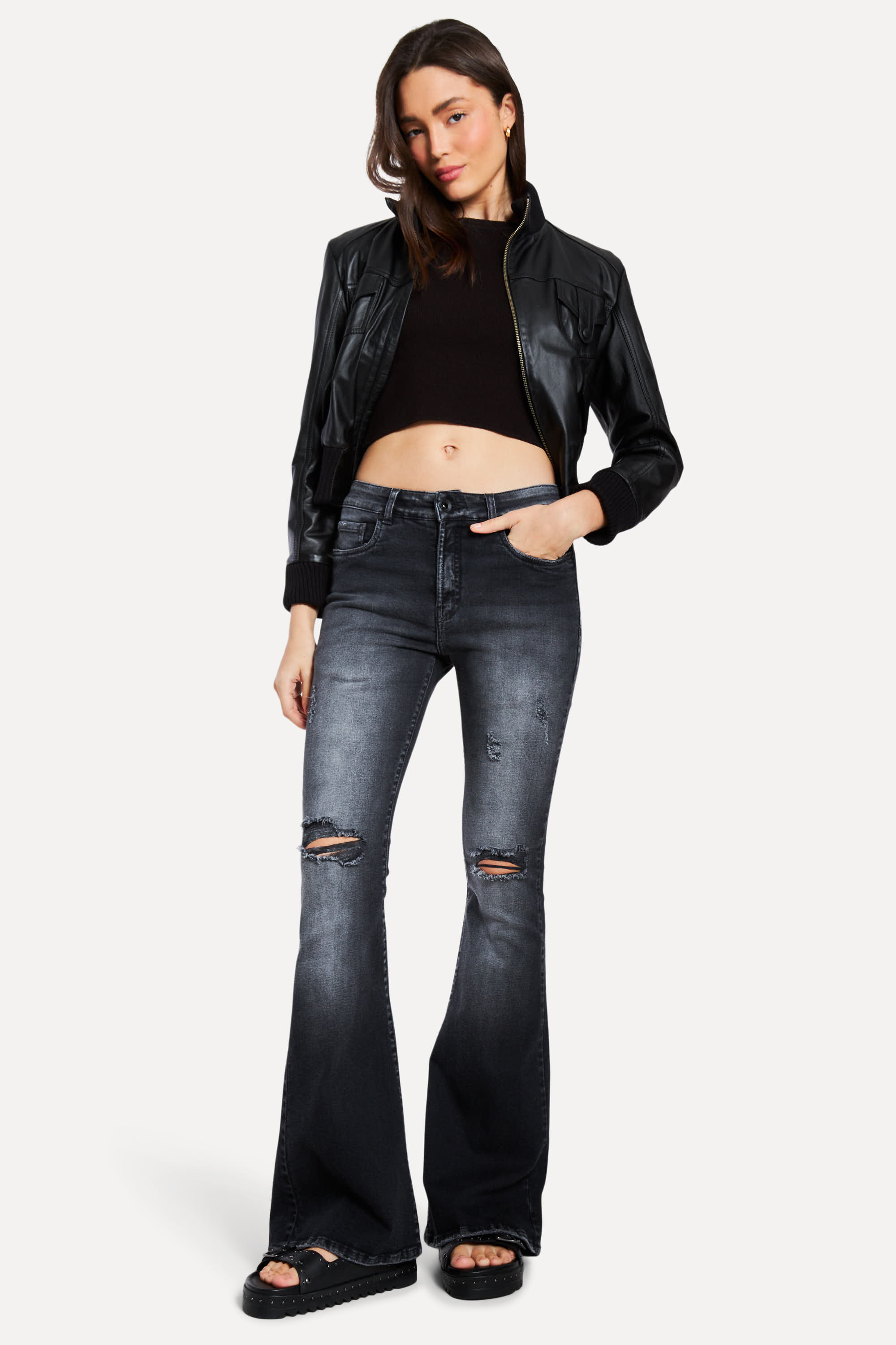 A Calça Black Jeans Nina Flare é ideal para mulheres que buscam um look moderno e urbano. A modelagem é mais justa na cintura até os joelhos e abaixo mais soltinha. Pode ser usada com partes de cima mais ajustadas e complementar com sandália ou tênis. Calça Feminina Reversa produzida eticamente no Brasil. Comprando esta peça, você viabiliza cinco pratos de comida através do nosso programa 1P5P. A modelo mede 1,77 m, 62 cm de cintura e 89 cm de quadril.