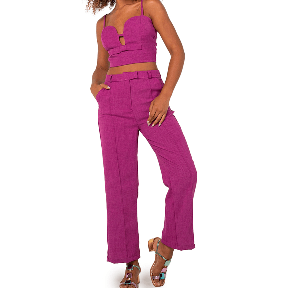 Calça cigarrete feminina pantalona confeccionada em linho, um tecido natural e com ótima respirabilidade; A modelagem cigarrete possui comprimento levemente curto, cintura alta com cós aplicado com passantes e bolsas laterais no modelo faca; Combine sua calça cigarrete em linho em um visual casual; Aposte com camisas trabalhadas e sandálias de salto bloco para um look elegante e ideal para o home office, já para um visual moderno, aposte com top de laise e rasteias coloridas; A calça cigarrete é um clássico no guarda-roupa feminino e ideal para um look trendy de verão, aposte!<br><br><br>.<br><br><br>Produto : Calça Cigarrete Linho Magenta<br>Código : CAL2216MAG<br>Categoria: Calça<br>Cor: Magenta<br>Tecido: Linho<br>Composição: 20% Linho/ 40% Viscose/ 40% Poliester<br>Peso :300 g<br>Gênero: Feminino<br>Marca: Vértice<br><br>.<br><br><br>Medidas<br><br>P - Busto até 90 cm l Cintura até 71 cm l Quadril até 99 Cm.<br>M - Busto até 96 cm l Cintura até 77 cm l Quadril até 102 cm.<br>G - Busto até 102 cm l Cintura 83 cm l Quadril 111 cm.<br>GG - Busto 108 cm l Cintura até 89 cm l Quadril até 117 cm.<br>EGG - Busto até 114 cm l Cintura até 95 cm l Quadril até 123 cm.<br><br><br><br><br><br><br><br><br><br><br><br><br><br><br><br><br><br><br><br><br><br>