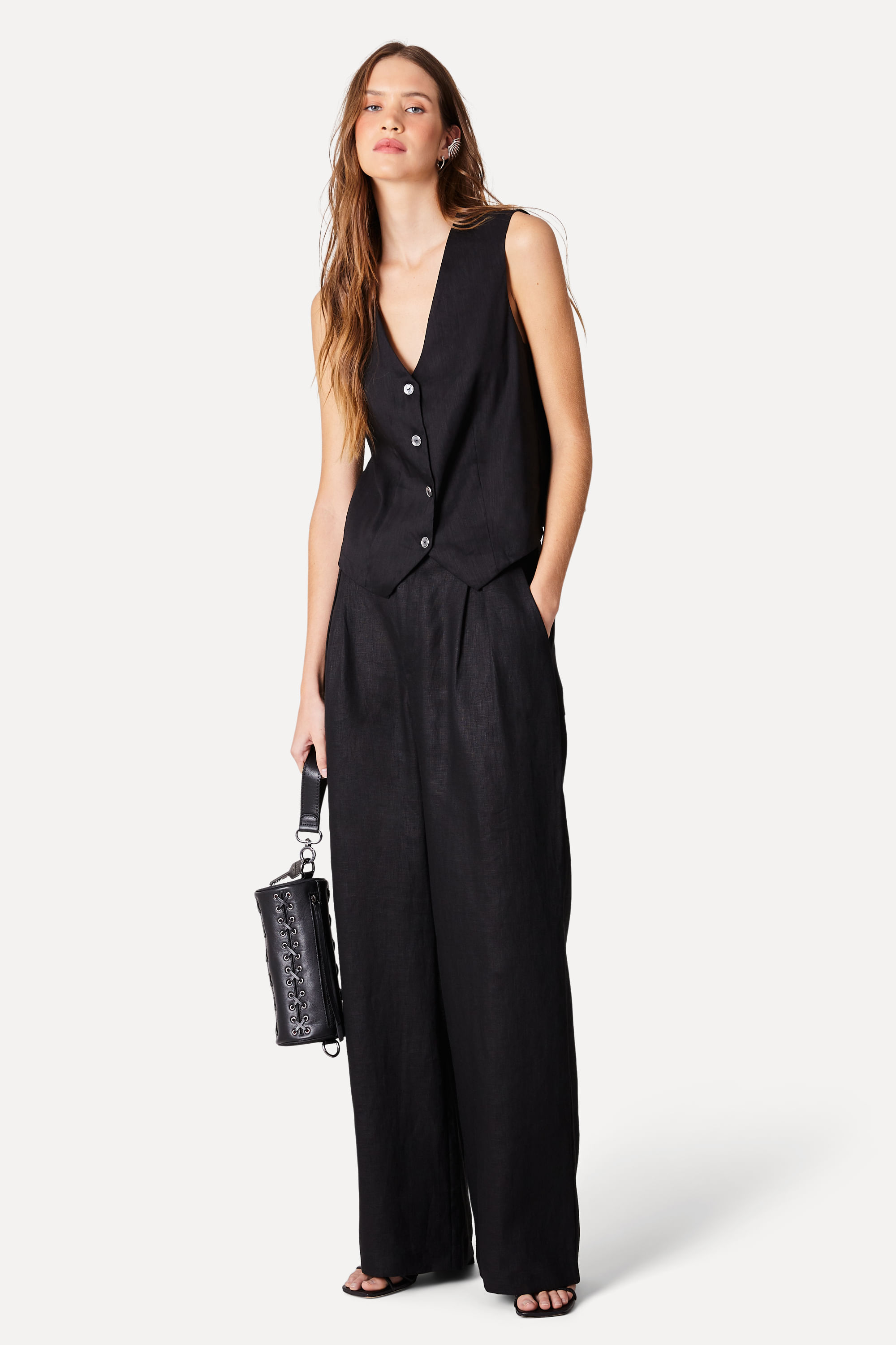 A Calça Alfaiataria Linho Tech traz a sofisticação da alfaiataria com o conforto e frescor únicos do linho. Bem soltinha e na cor preta, ele possui bolsos frontais e traseiros. Combine com o Colete Alfaiataria Linho Tech Preto e tenha um look completo! A modelo tem 1,76 de altura, 80 de busto e veste 36. Comprando esta peça, você viabiliza cinco pratos de comida através do nosso Programa 1P5P. Calça produzida eticamente no Brasil.