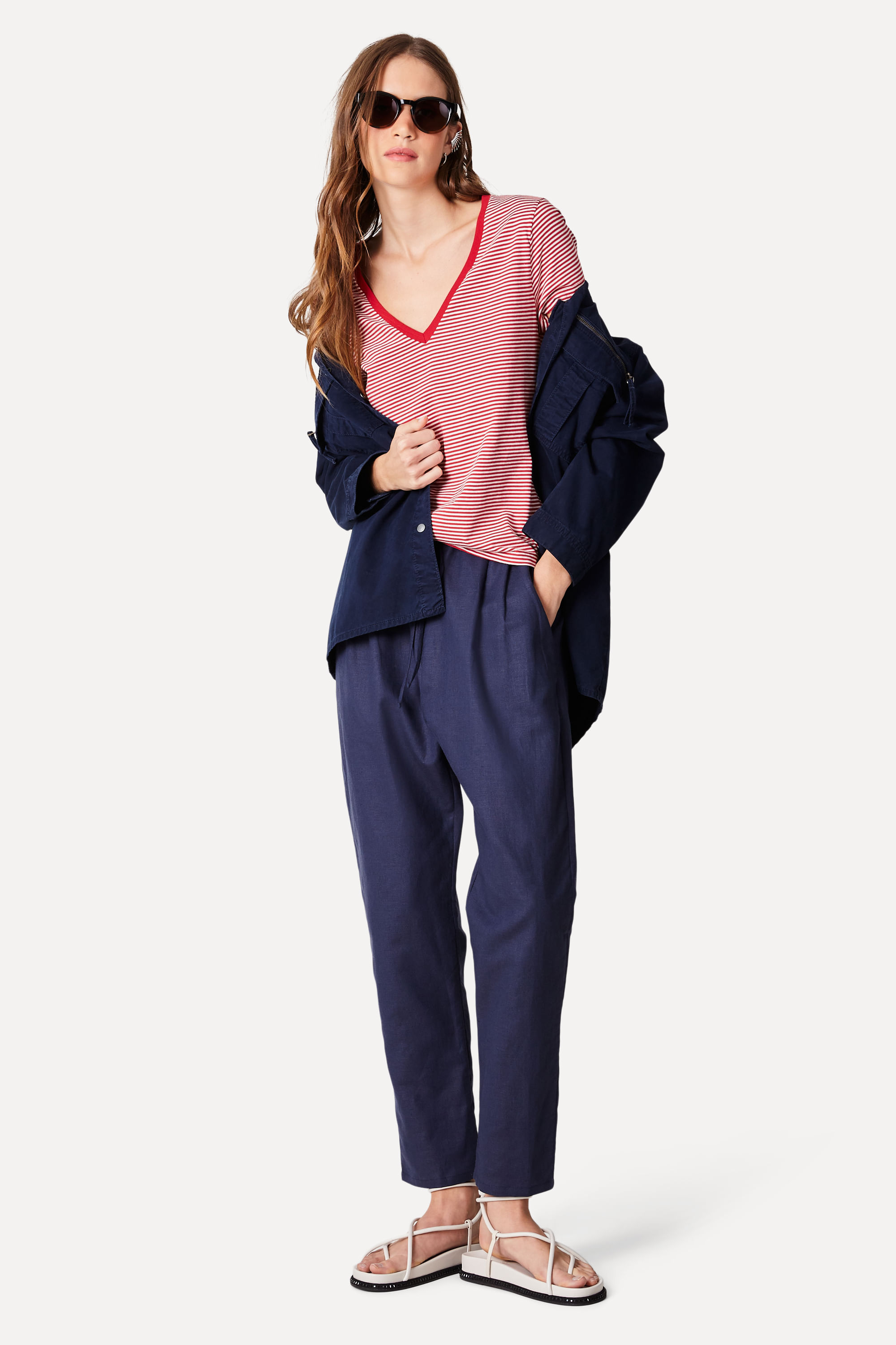 Precisando de uma calça soltinha pros dias quentes e que te deixe elegante? Conheça a Calça Linen Marinho! Com uma modelagem mais soltinha e menor comprimento, ela se destaca pelo conforto que proporciona, com fechamento por elástico e cadarço. Possui também bolsos faca. Super versátil, combine com t-shirts, camisetas, camisas, jaquetas, tênis e sandálias para arrasar em qualquer ocasião! A modelo tem 1,77 de altura, 80 de busto e veste 36. Comprando esta peça, você viabiliza cinco pratos de comida através do nosso Programa 1P5P. Calça produzida eticamente no Brasil.