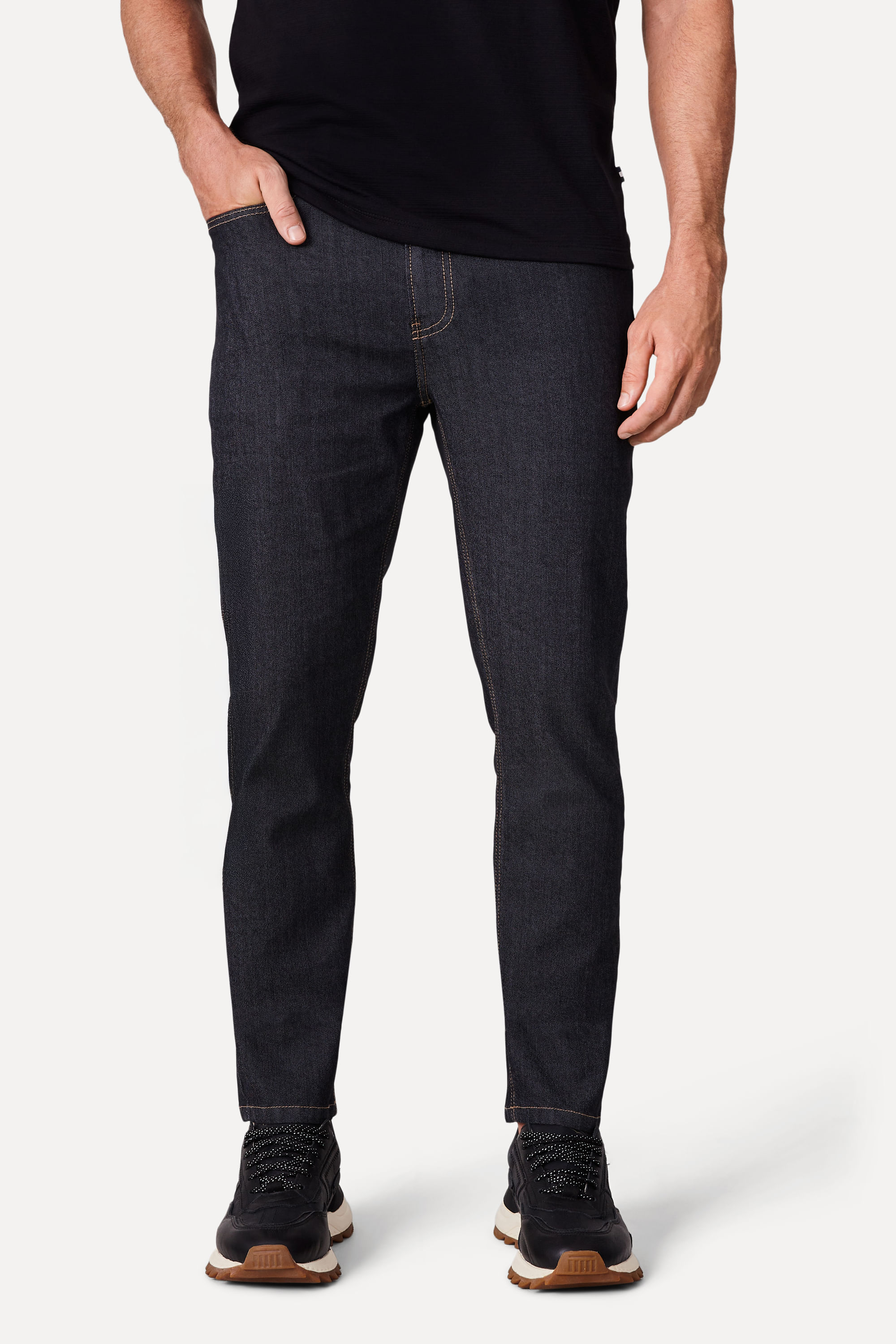 Procurando uma calça pro trabalho ou pro rolé? Aposte na Calça Jeans Slim Joel! Em modelagem Slim (visual contemporâneo alinhado ao corpo, mas não tão colado quanto a skinny, afunilando levemente na perna até a barra), é feita de algodão, poliéster e elastano, permitindo total liberdade de movimentos. Sua lavagem preta acinzentada combina com qualquer situação, até as mais formais. Possui passador para cintos, bolsos (incluindo um só para o celular), metais pretos personalizados e assinatura Reserva Jeans. Combine com camisas, camisetas ou jaquetas e tênis. O modelo tem 1,87 de altura, 100 de tórax e veste 42. Comprando esta peça, você viabiliza cinco pratos de comida através do nosso Programa 1P5P. Calça produzida eticamente no Brasil.