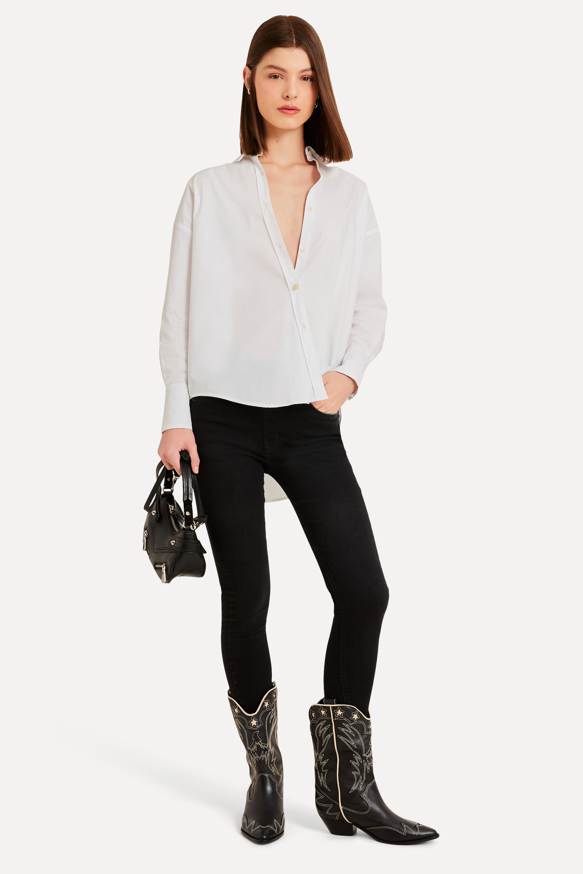 CALCA JEANS SUPER SKINNY BLACK. Comprando esta peça, você viabiliza cinco pratos de comida através do nosso Programa 1P5P. Camiseta produzida eticamente no Brasil..
