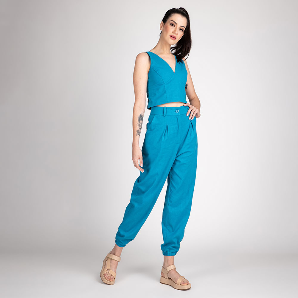 A Calça Linho Jogger com o tecido leve trazendo conforto e elegância em uma só peça, perfeita para office look ou um visual mais despojado caso queira.<br>A calça linho jogger pode ser combinada com uma sandália de salto, ou um Oxford uma das opções para suas produções, você pode combinar com peças de seda também fica um look bem elegante, seja qual for sua escolha ela da um Up nos seus looks.<br>Poucas pessoas sabem que o linho é feito de fibra natural o tecido estrutural e ao mesmo tempo leve fica perfeito para os dias mais quentes em um office look, se você quer ser adepta do eco fashion escolha a sua e arrase.<br><br><br>.<br>Produto: Calça linho Jogger Azul<br>Código: CAL2201AZU<br>Categoria: Calças.<br>Cor: Azul<br>Tecido :Linho<br>Composição:70%Viscose 30% Linho<br>Peso: 355 G<br>Gênero: Feminino.<br>Marca: Vértice.. Medidas. P - Busto até 90 cm l Cintura até 71 cm l Quadril até 99 Cm. M - Busto até 96 cm l Cintura até 77 cm l Quadril até 102 cm. G - Busto até 102 cm l Cintura 83 cm l Quadril 111 cm. GG - Busto 108 cm l Cintura até 89 cm l Quadril até 117 cm. EGG - Busto até 114 cm l Cintura até 95 cm l Quadril até 123 cm.
