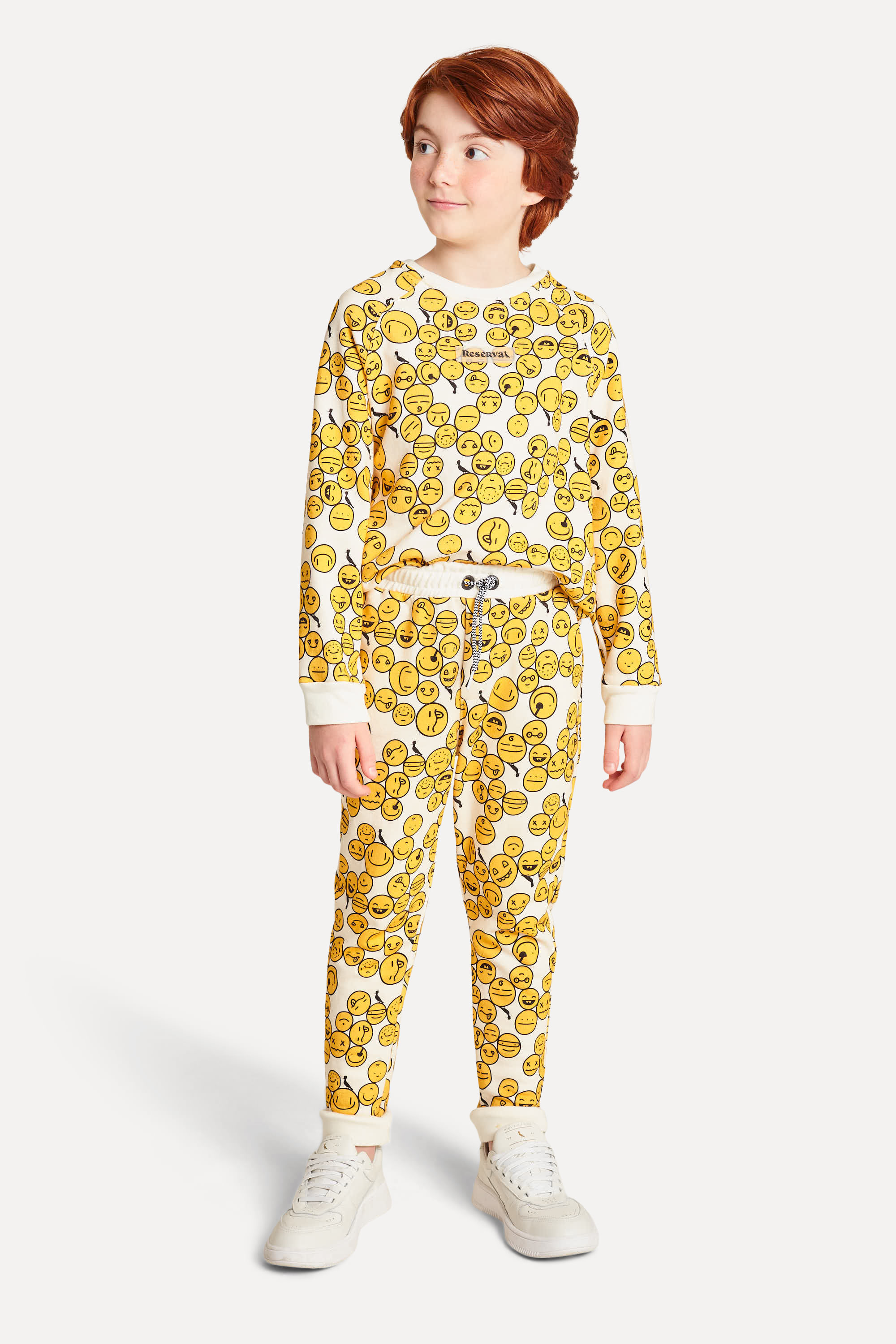 Calça da linha infantil Reserva Mini. Em moletom, o modelo moderninho é um pouco mais ajustado à panturrilha e ganhou cadarço no cós. A estampa divertida de emojis é sucesso certo com a criançada! Produzido eticamente no Brasil. Comprando esta peça, você complementa cinco pratos de comida através do nosso programa 1P=5P.