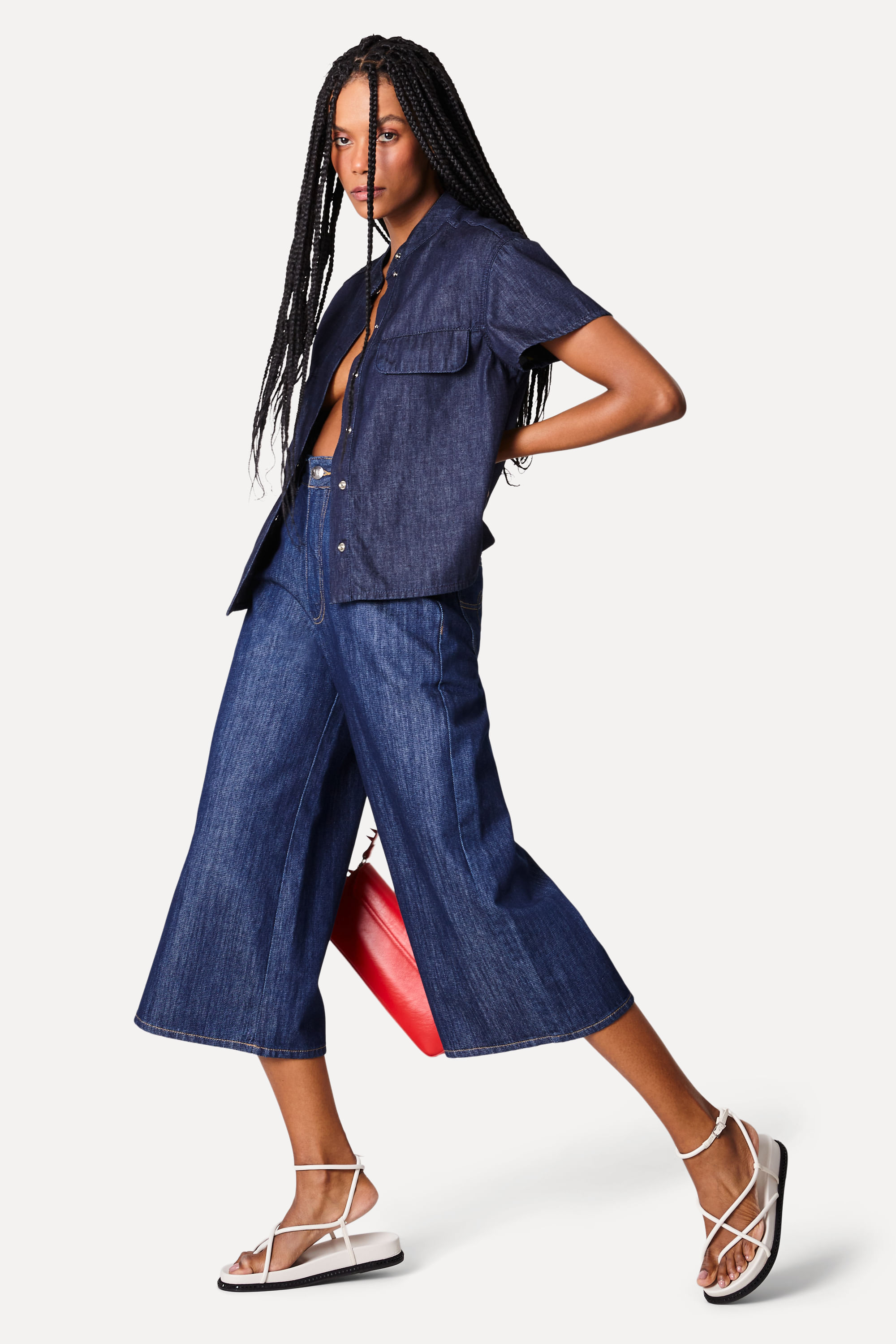 Descubra a elegância descontraída da Calça Pantacourt Jeans Alfaiataria. Perfeita para manter a elegância nos dias quentes, essa calça possui o conforto do nosso jeans com corte de alfaiataria e bainha na altura do joelho. Possui bolsos frontais e traseiro e passador para cintos. Combine com t-shirts, camisetas, camisas, jaquetas, tênis ou sandálias e arrase! A modelo tem 1,77 de altura, 82 de busto e veste 36. Comprando esta peça, você viabiliza cinco pratos de comida através do nosso Programa 1P5P. Calça produzida eticamente no Brasil.