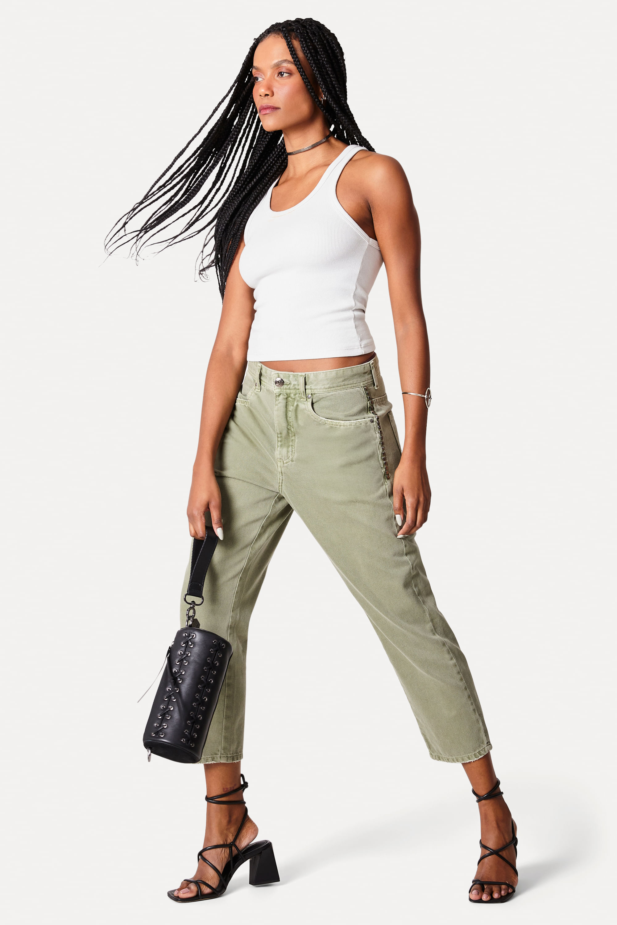 A Calça Sarja Boyfriend Lila Tachas é a peça perfeita para compor um look despojado e cheio de estilo nos dias quentes. Na cor verde militar, possui bolsos faca frontais e passador para cintos. Seu charme fica por conta das tachinhas nas laterais. Combine com a Camisa Sarja Tachas e tênis para um look completo! A modelo tem 1,77 de altura, 82 de busto e veste 36. Comprando esta peça, você viabiliza cinco pratos de comida através do nosso Programa 1P5P. Calça produzida eticamente no Brasil.