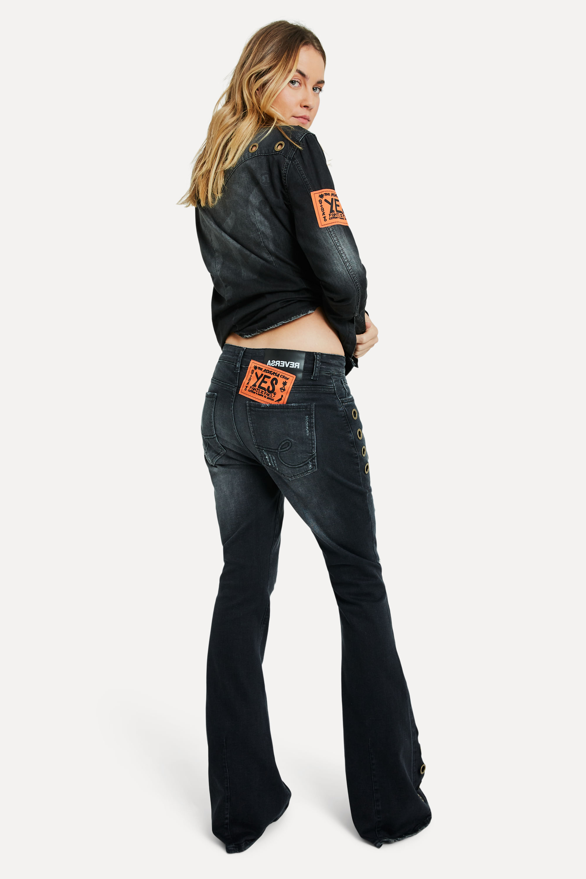 A Calça Yes Black Jeans Nina Flare é perfeita para mulheres modernas e urbanas. Sua modelagem flare traz um ar mais descontraído e moderno para a peça, que pode ser usada com peças mais secas, ou com a camisa da mesma família. A lavagem black jeans dá um toque de sofisticação à calça, e os ilhóses dão um toque de personalidade. É uma calça com ar mais urbano, que pode ser usada em diversas ocasiões. Calça Flare Reversa produzida eticamente no Brasil. Comprando esta peça, você viabiliza cinco pratos de comida através do nosso programa 1P5P. A modelo mede 1,76 m de altura, 60 cm de cintura e 90 cm de quadril.