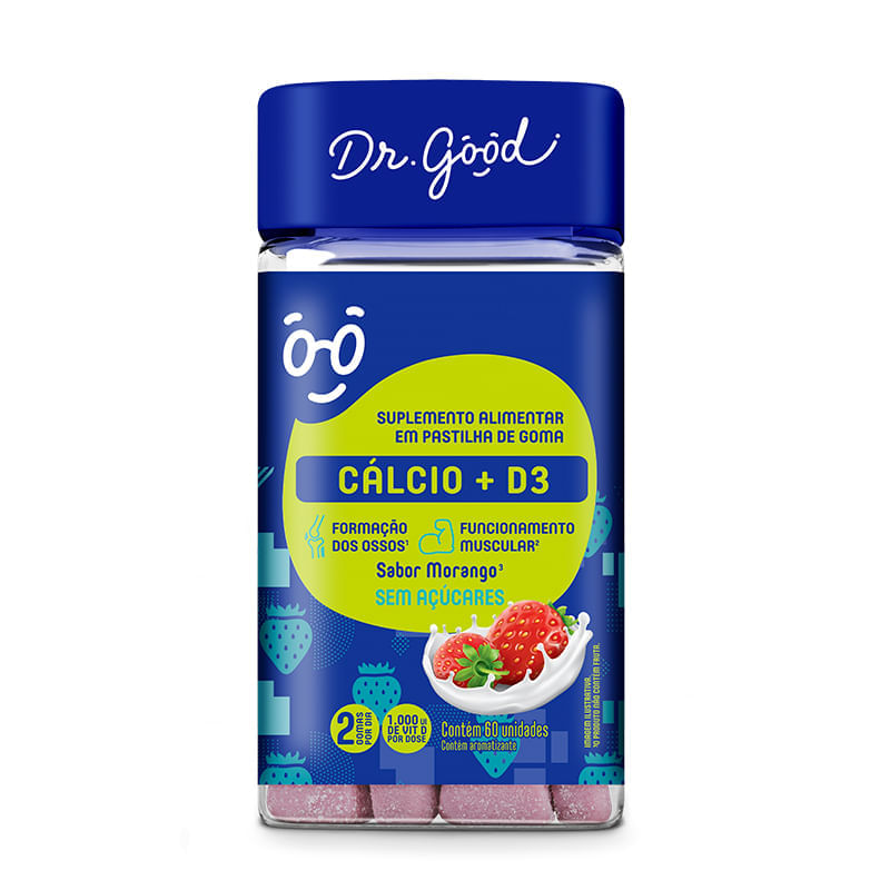 <p><strong>Cálcio + D3 Morango Dr Good 60 gomas</strong> é um suplemento alimentar em goma de Cálcio Vitamina D3 (<strong>1000UI por dose</strong>) juntos em um único gummy, com delicioso sabor de morango, para sua saúde óssea. Além de fortalecer os ossos, melhora a absorção e retenção de cálcio no organismo em todas as fases da vida.</p> Sugestão de consumo: <p>Recomendamos consumir 2 unidades ao dia. Uso recomendado para adultos (maiores de 19 anos).</p> Motivos para escolher o produto: <ul> <li> <p>Auxilia no desenvolvimento e manutenção da estrutura de ossos e dentes</p> </li> <li> <p>Contração muscular no ciclo dos batimentos cardíacos</p> </li> <li> <p>Regula a secreção de insulina</p> </li> <li> <p>Combate doenças autoimunes</p> </li> <li> <p>Favorece a força muscular</p> </li> <li> <p>Auxilia no Controle da Pressão Arterial</p> </li> <li> <p>Transmissão e regulação dos impulsos nervosos</p> </li> <li> <p>Sem corantes artificiais</p> </li> <li> <p>Sem açúcares</p> </li> <li> <p>Sem aromas artificiais</p> </li> <li> <p>Sem glúten</p> </li> <li> <p>Sem lactose</p> </li> </ul> Sobre os ingredientes: <p>Água, fosfato tricálcico, amido, concentrado vegetal de cenoura e groselha-negra, colecalciferol, edulcorantes: maltitol e sorbitol, geleificante: gelatina, agente de corpo: polidextrose, acidulantes: ácido cítrico e ácido láctico aromatizante e antioxidante lactato de sódio. Não contém Glúten.</p> Sobre a marca: <p> <strong>Dr Good</strong> é uma marca voltada para promoção da saudabilidade com segurança e simplicidade, seguindo tendências globais que impulsionam o mercado de suplementos alimentares. Com altos investimentos em inovação, sabor e praticidade, desenvolveu a primeira linha completa de suplementos vitamínicos em gomas do Brasil.</p>