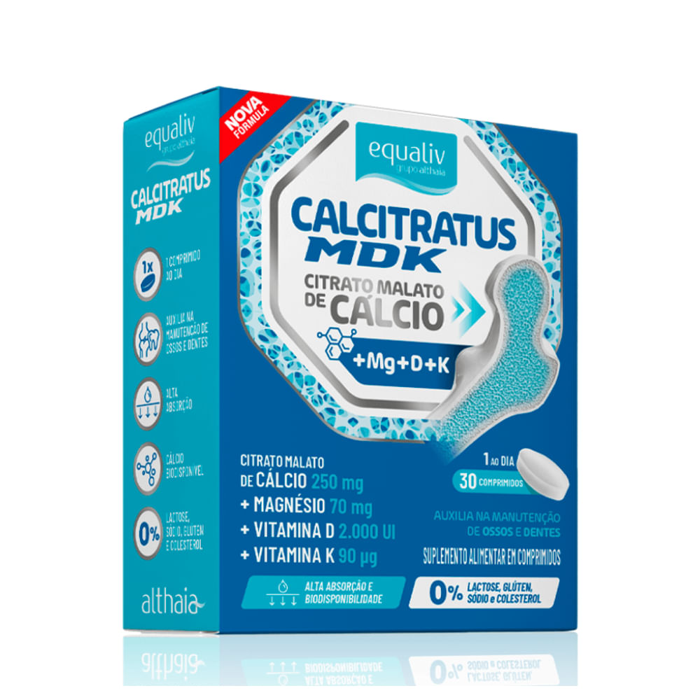 <p dir="ltr">O <strong>Calcitratus Equaliv</strong> é um suplemento alimentar formulado com cálcio e vitamina D, nutrientes que auxiliam na formação e manutenção de ossos e dentes. O cálcio também participa no processo de coagulação do sangue e na contração muscular, enquanto a vitamina D auxilia na absorção de cálcio e fósforo.</p> <h2 dir="ltr">Sugestão de consumo:</h2> <p dir="ltr">Consumir 1 comprimido ao dia ou conforme orientação de médico ou nutricionista.</p> <h2 dir="ltr">Motivos para escolher o produto:</h2> <ul> <li dir="ltr" aria-level="1"> <p dir="ltr" role="presentation">Contém 250 mg de cálcio, que auxilia na formação e manutenção de ossos e dentes;</p> </li> <li dir="ltr" aria-level="1"> <p dir="ltr" role="presentation">Contém 200 UI de vitamina D3, que auxilia na absorção de cálcio e fósforo;</p> </li> <li dir="ltr" aria-level="1"> <p dir="ltr" role="presentation">33 ug de Vitamina K2 e 63 mg de Magnésio; </p> </li> <li dir="ltr" aria-level="1"> <p dir="ltr" role="presentation">Praticidade em comprimidos;</p> </li> <li dir="ltr" aria-level="1"> <p dir="ltr" role="presentation">Sem adição de açúcares; </p> </li> <li dir="ltr" aria-level="1"> <p dir="ltr" role="presentation">Sem glúten. </p> </li> </ul> <h2 dir="ltr">A Marca</h2> <p dir="ltr">A <strong>Equaliv </strong>é uma marca brasileira que une inovação, tecnologia e ciência para desenvolver suplementos alimentares de alta qualidade. Seu portfólio é pensado para atender diferentes necessidades do dia a dia, oferecendo fórmulas seguras e eficazes, elaboradas com matérias-primas selecionadas e processos que garantem pureza e confiabilidade. Com o compromisso de promover saúde, bem-estar e mais vitalidade, a Equaliv busca apoiar escolhas inteligentes e conscientes, sempre com foco na qualidade de vida.</p>