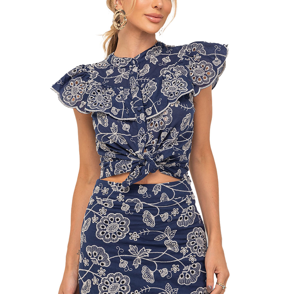 Camisa feminina confeccionada em laise, um tecido com bordados florais e caimento leve; Modelo conta com amarração frontal, babados aplicados e fechamento frontal por botões; O bordado em flores traz feminilidade ao visual; A camisa com babados e amarração frontal é a peça ideal para trazer informação de moda para suas produções, podendo ser usada em um day off descontraído ou para um look corporativo; Invista com calça de alfaiataria e sandálias de salto bloco, para o seu office look; As camisas com design inovadores estão cada vez mais fazendo parte do look das fashionistas que estão conectadas com as últimas tendências, invista!<br><br>.<br><br><br>Produto: Camisa Amarração Laise Marinho<br>Categoria: Camisa<br>Cor: Marinho<br>Manga: Manga Curta<br>Gola: Gola Camisa<br>Tecido: Laise Poa<br>Composição : 20% Poliester /80% algodão<br>Peso :200 g<br>Gênero: Feminino<br>Marca: Vértice<br>.<br><br><br><br><br>Medidas.<br><br><br>P - Busto até 90 cm l Cintura até 71 cm l Quadril até 99 Cm.<br>M - Busto até 96 cm l Cintura até 77 cm l Quadril até 102 cm.<br>G - Busto até 102 cm l Cintura 83 cm l Quadril 111 cm.<br>GG - Busto 108 cm l Cintura até 89 cm l Quadril até 117 cm.<br>EGG - Busto até 114 cm l Cintura até 95 cm l Quadril até 123 cm.<br><br><br><br><br><br><br><br><br><br><br><br><br><br><br><br><br><br><br><br><br><br><br><br><br><br><br><br><br><br><br><br><br>
