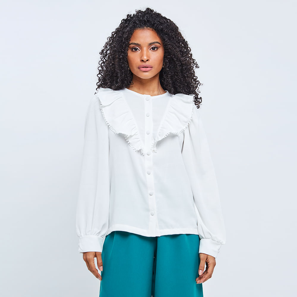 A Camisa Babado Manga Ampla com babado com renda frontal ,com botões com manga longa tecido confortável e leve , pra você que quer uma peça cheia de estilo com muito conforto ela é perfeita.<br><br>A Camisa Babado Manga Ampla é uma peça muito versátil ,caso queira fazer conjunto temos a calça pantacourt fluida que dá um Up na sua produção ,ela pode ser usada tanto em um office look como em looks mais despojados ,para o trabalho use peças com a cintura alta ,como saias e calças de alfaiataria que deixam o visual mais formal mas sem deixar de ser moderno ,abuse dos sapatos de salto do bico fino e mules para deixar seu look mais elegante ,já para um visual mais casual ela fica perfeita com jeans como ambas são peças mais básicas invista nos acessórios como mais colar brincos ,se optar por um modelo mais reto pode usar com tênis ,saia os modelos Midi com tecidos leves e soltos trazem delicadeza a combinação ,caso queira um ar mais divertido coloque um tênis branco seja qual for sua escolha você vai arrasar.<br><br><br><br>Produto : Camisa Babado Manga Ampla <br>Código : CAM2207OFF<br>Categoria: Blusas.<br><br>Cor: Off White<br>Manga: Curta.<br><br>Gola: Redonda <br>Tecido: Crepe<br>Composição : 100% Poliéster<br>Peso :300 g<br>Gênero: Feminino.<br><br>Marca: Vértice<br><br>Medidas.<br><br><br>P - Busto até 90 cm l Cintura até 71 cm l Quadril até 99 Cm.<br><br><br>M - Busto até 96 cm l Cintura até 77 cm l Quadril até 102 cm.<br><br><br>G - Busto até 102 cm l Cintura 83 cm l Quadril 111 cm.<br><br><br>GG - Busto 108 cm l Cintura até 89 cm l Quadril até 117 cm.<br><br><br>EGG - Busto até 114 cm l Cintura até 95 cm l Quadril até 123 cm.<br>
