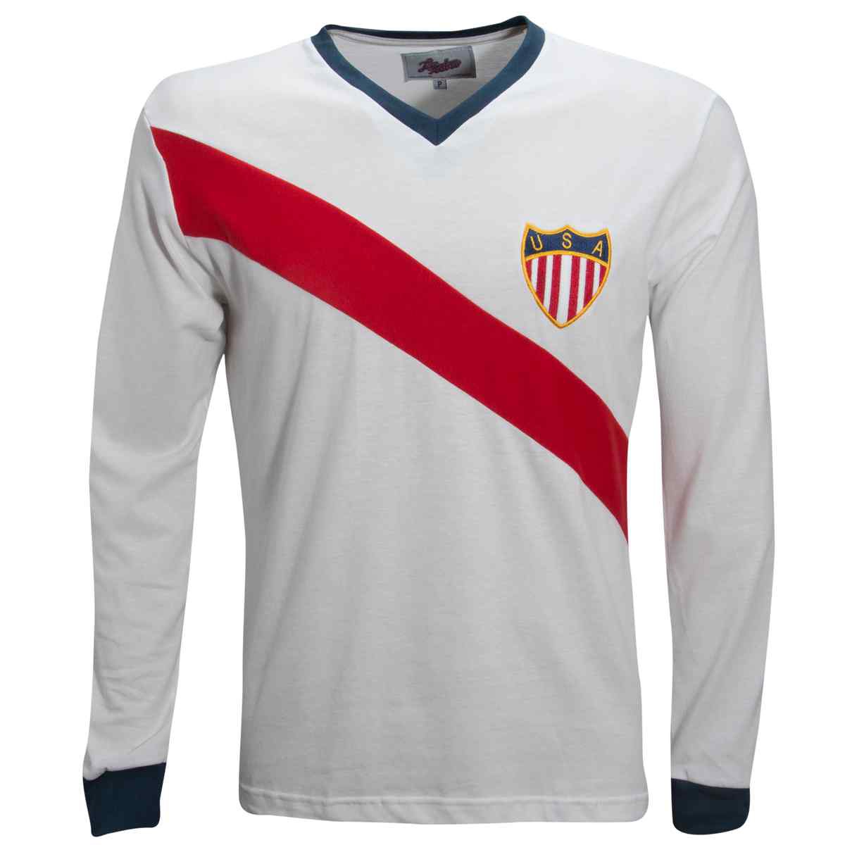 Relembre a época de ouro do futebol! Quando de fato torcer era mais prazeroso e tínhamos jogadores diferenciados, no Brasil e no mundo. <br /> Apresentamos a você uma grande variedade de camisas retrô, de clubes brasileiros, seleções e clubes internacionais.<br /> O manto foi produzido com tecido 100% algodão premium, toque macio e confortável. <br /> O escudo retrô bordado mantém a originalidade da peça. Uso casual, indicado para momentos de lazer e ir ao estádio.<br /> <br /> Sku: eua50<br /> <br /> Características:<br /> <br /> Nome: Camisa Estados Unidos 1950 Liga Retrô - Branca<br /> Gênero: Masculino<br /> Faixa etária: Adulto<br /> Indicado: Dia a Dia<br /> Marca: Liga Retrô<br /> Clube: Internacional<br /> Time: Estados Unidos<br /> Manga: Longa <br /> Gola: V<br /> Escudo: Bordado<br /> Cor predominante: Branco<br /> Estilo da peça: Retrô<br /> Composição do Tecido/Material: Algodão<br /> Personalização: Não permite<br /> Garantia de Fabricação: 3 meses<br /> <br /> Tabela de medidas:<br /> Dimensões Aproximadas (Largura x Altura x Manga)<br /> <br /> Manga Longa<br /> <br /> P: 53.5 x 68.5 x 66 cm<br /> M: 55.5 x 70.5 x 67.5 cm<br /> G: 57.5 x 73.5 x 69 cm<br /> GG: 59.5 x 75.5 x 70.5 cm<br /> GGG: 61 x 79 x 73 cm<br /> 4G: 63 X 82 cm<br /> <br /> Informações adicionais:<br /> <br /> Não realizamos personalização.<br /> <br /> Conteúdo da embalagem:<br /> 1 Camisa Estados Unidos 1950 Liga Retrô - Branca