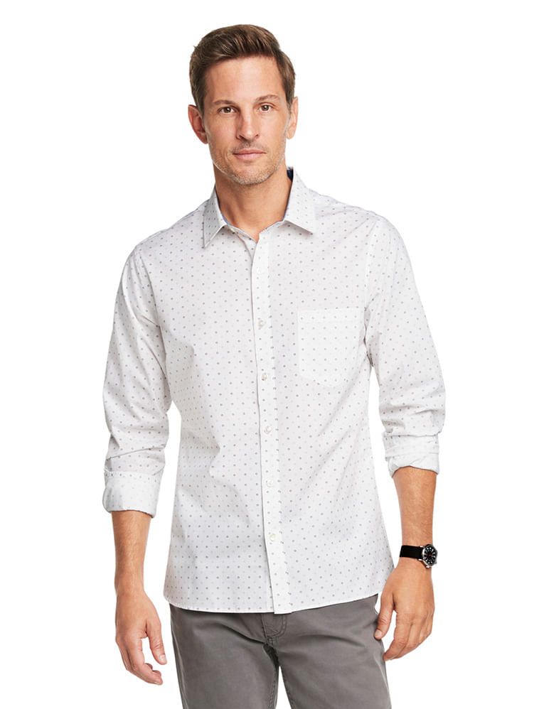 A camisa manga longa em mini print poás azul em fundo branco da VAN HEUSEN tem uma modelagem slim, com um bolso chapado no peito. Pé de gola em contraste. Ótima opção para o homem moderno , Pode ser usada em look de trabalho ou de forma mais casual .Tem algodão em sua composição que a torna super confortável, respirável, fácil de lavar e secar. Tem tecnologia easy iron, ou seja quase não amassa.