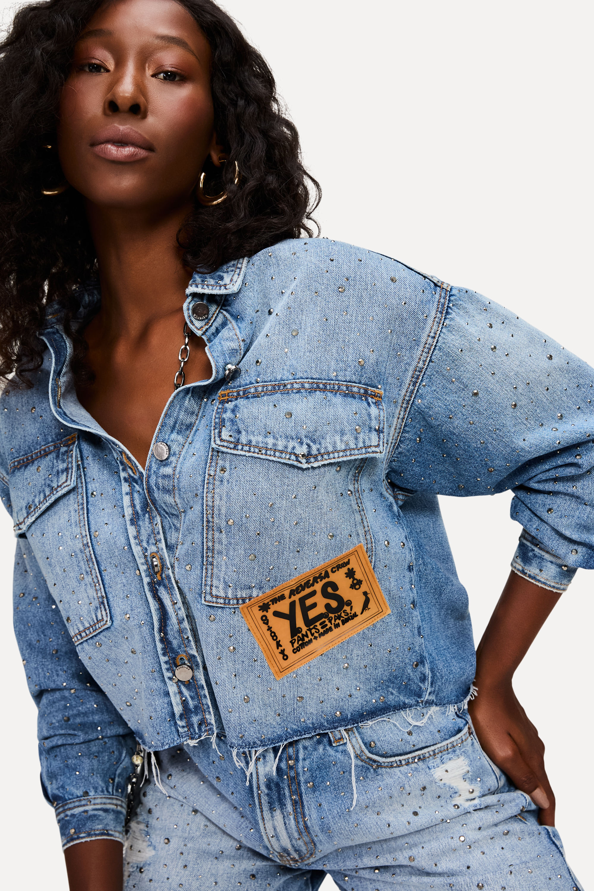 Mostre toda sua brasilidade com a Camisa Jeans Shine Yes Brazil! Feita em algodão de alta qualidade, proporciona muito conforto. Possui manga longa e fechamento frontal e nos punhos por botões. Seu chame fica por conta dos brilhinhos que compõem toda a peça e a etiqueta de assinatura da collab Reversa + Yes Brazil. Combine com shorts ou saias, tênis ou sandálias. A modelo tem 1,78 de altura, 82 de busto e veste 36. Comprando esta peça, você viabiliza cinco pratos de comida através do nosso Programa 1P5P. Camisa produzida eticamente no Brasil.