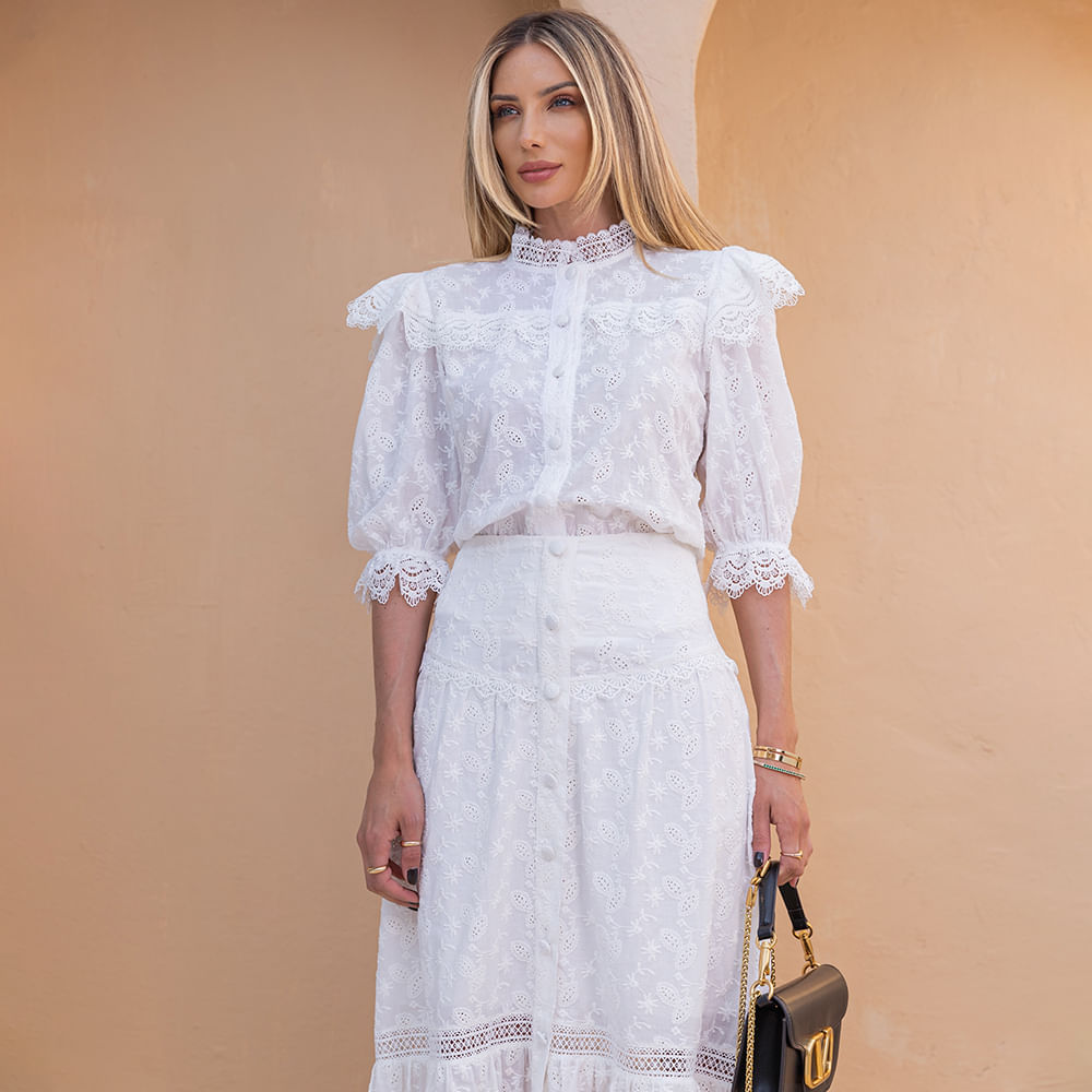 A Camisa de Laise com Babados é uma peça encantadora que combina elegância, feminilidade e um toque romântico; Feita em tecido de laise, botões forrados e aviamentos nas mangas, nos ombros e gola, que acrescentam charme e delicadeza ao visual; A camisa de laise com babados pode ser combinada de várias maneiras; Para um visual elegante e sofisticado, você pode usá-la a saia midi de laise ou calça de alfaiataria, criando um contraste entre o romantismo dos babados e a formalidade das peças; Para um estilo mais casual e descontraído, ela pode ser usada com jeans e rasteiras, criando um look feminino e despojado; Uma tendência de moda relacionada à camisa de laise com babados é a valorização do estilo romântico e feminino, com um toque de leveza e delicadeza; Essa tendência busca resgatar elementos vintage e criar looks encantadores e cheios de personalidade; <br>Os babados são o destaque dessa tendência; Podem estar presentes nas mangas, no decote, na barra ou em outras áreas estratégicas da camisa, adicionando movimento, volume e um toque feminino ao visual;<br><br><br>.<br><br>Produto: Camisa Laise Babados Offwhite<br>Categoria: Camisa <br>Cor: Offwhite <br>Manga: Manga 3/4<br>Gola: Gola Redonda <br>Tecido: Linho<br>Composição: 100% Algodão <br>Peso : 300g<br>Gênero: Feminino<br>Marca: Vértice<br><br>Medidas da Modelo<br>Altura: 1,70 cm<br>Busto: 89 cm<br>Cintura: 65 cm<br>Quadril: 94 cm<br><br>A MODELO VESTE O TAMANHO P<br><br>.<br><br>Medidas.<br><br>P - Busto até 90 cm l Cintura até 71 cm l Quadril até 99 Cm.<br>M - Busto até 96 cm l Cintura até 77 cm l Quadril até 102 cm.<br>G - Busto até 102 cm l Cintura 83 cm l Quadril 111 cm.<br>GG - Busto 108 cm l Cintura até 89 cm l Quadril até 117 cm.<br>EGG - Busto até 114 cm l Cintura até 95 cm l Quadril até 123 cm.<br><br><br><br><br>