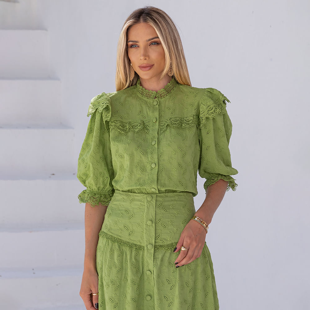 A Camisa de Laise com Babados é uma peça encantadora que combina elegância, feminilidade e um toque romântico; Feita em tecido de laise, botões forrados e aviamentos nas mangas, nos ombros e gola, que acrescentam charme e delicadeza ao visual; A camisa de laise com babados pode ser combinada de várias maneiras; Para um visual elegante e sofisticado, você pode usá-la a saia midi de laise ou calça de alfaiataria, criando um contraste entre o romantismo dos babados e a formalidade das peças; Para um estilo mais casual e descontraído, ela pode ser usada com jeans e rasteiras, criando um look feminino e despojado; Uma tendência de moda relacionada à camisa de laise com babados é a valorização do estilo romântico e feminino, com um toque de leveza e delicadeza; Essa tendência busca resgatar elementos vintage e criar looks encantadores e cheios de personalidade; <br>Os babados são o destaque dessa tendência; Podem estar presentes nas mangas, no decote, na barra ou em outras áreas estratégicas da camisa, adicionando movimento, volume e um toque feminino ao visual;<br><br><br>.<br><br>Produto: Camisa Laise Babados Verde<br>Categoria: Camisa <br>Cor: Verde<br>Manga: Manga 3/4<br>Gola: Gola Redonda <br>Tecido: Linho<br>Composição: 100% Algodão <br>Peso : 300g<br>Gênero: Feminino<br>Marca: Vértice<br><br>Medidas da Modelo<br>Altura: 1,70 cm<br>Busto: 89 cm<br>Cintura: 65 cm<br>Quadril: 94 cm<br><br>A MODELO VESTE O TAMANHO P<br><br>.<br><br>Medidas.<br><br>P - Busto até 90 cm l Cintura até 71 cm l Quadril até 99 Cm.<br>M - Busto até 96 cm l Cintura até 77 cm l Quadril até 102 cm.<br>G - Busto até 102 cm l Cintura 83 cm l Quadril 111 cm.<br>GG - Busto 108 cm l Cintura até 89 cm l Quadril até 117 cm.<br>EGG - Busto até 114 cm l Cintura até 95 cm l Quadril até 123 cm.<br><br><br><br><br>