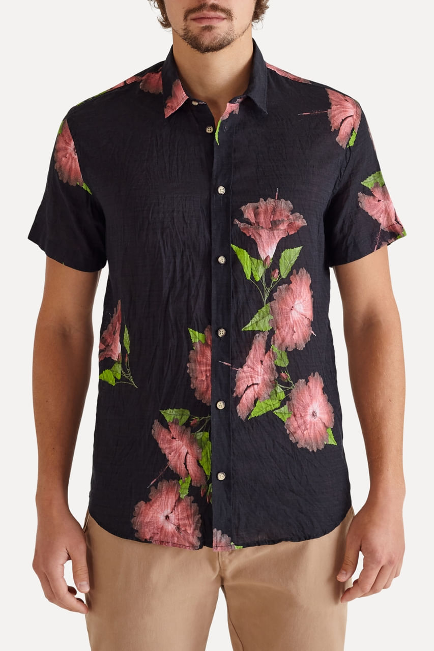 Feita especialmente para quem acha difícil usar camisa no calor. Incluímos a alegria de um dia de sol na estampa e cortamos as mangas para maior frescor. É de dar um nó! Não na cabeça, na peça mesmo. Essa camisa masculina esconde todo seu charme no visual amassadinho, por isso ela já chega pra você assim. Prazer, camisa Manga Curta Estampada Verão - sua nova camisa masculina. Um ícone Reserva funcional produzido eticamente no Brasil. Comprando esta peça, você viabiliza cinco pratos de comida através do nosso programa 1P5P.