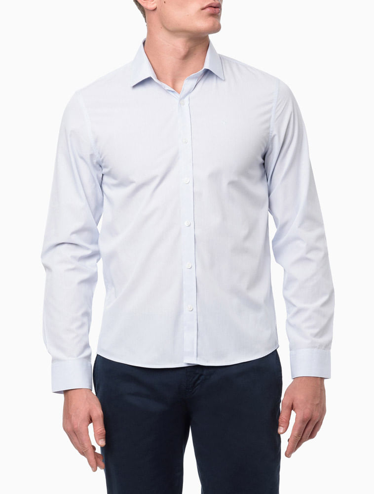 CAMISA CKS MANGA LONGA COM MINI LISTRADO DE ALGODÃO, MODELAGEM SLIM E ASSINATURA BORADDO NO PEITO