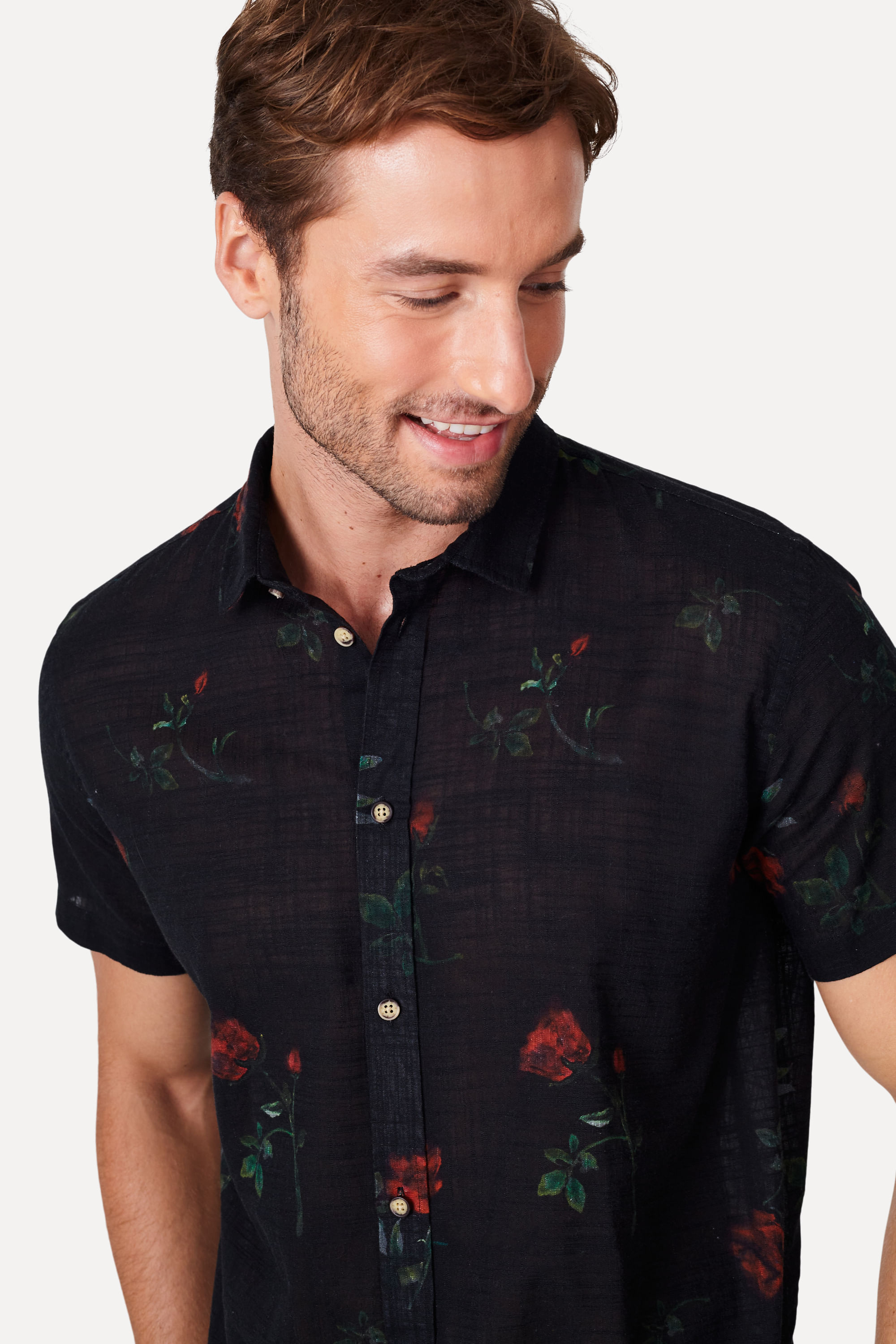 A Camisa Mc Estampa Black Roses é perfeita para quem busca um visual moderno e sofisticado. Feita 100% em algodão, possui manga curta e estampa de rosas em preto, vermelho e branco. É ideal para diversas ocasiões. Combine com calças jeans ou de sarja para um visual mais casual, ou até mesmo com uma calça de alfaiataria para um look mais elegante. O modelo tem 1,90 de altura, 98 de tórax e que veste 40. Comprando esta peça, você viabiliza cinco pratos de comida através do nosso Programa 1P5P. Camisa produzida eticamente no Brasil.