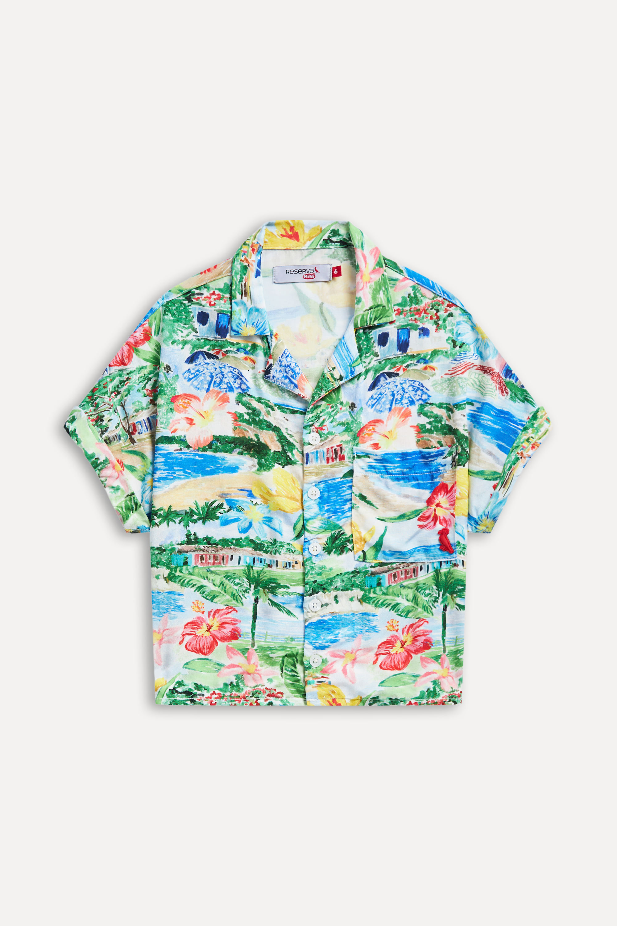 Camisa Cropped da Colecao Reserva Menina Verao 24. A peca e feita em tecido 100% viscose na estampa exclusiva "TRANCOSO" e tem um comprimento mais curto para ser usada com bottons de cintura alta.