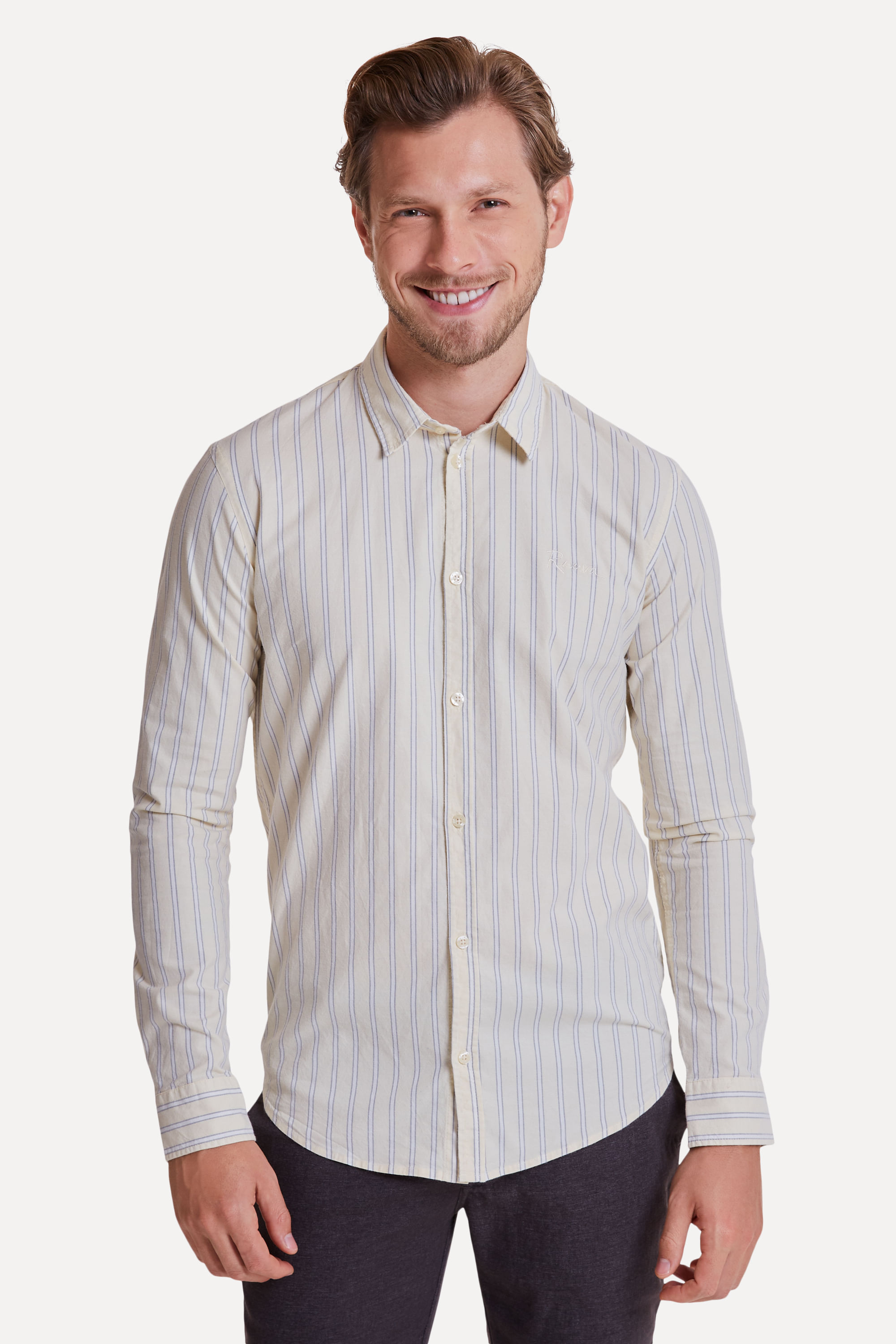 Um clássico da Reserva, a camisa manga longa Oxford tem modelagem slim, levemente ajustada ao corpo. Agora em um tecido listrado confeccionado em elastano, ela dá mais conforto e estilo a quem busca criar um visual mais tradicional. A gola button down é um charme à parte. Pra fechar com chave de ouro, ela conta com bordado exclusivo no peito. Camisa Reserva produzida eticamente no Brasil. Comprando esta peça, você viabiliza cinco pratos de comida através do nosso programa 1P5P.