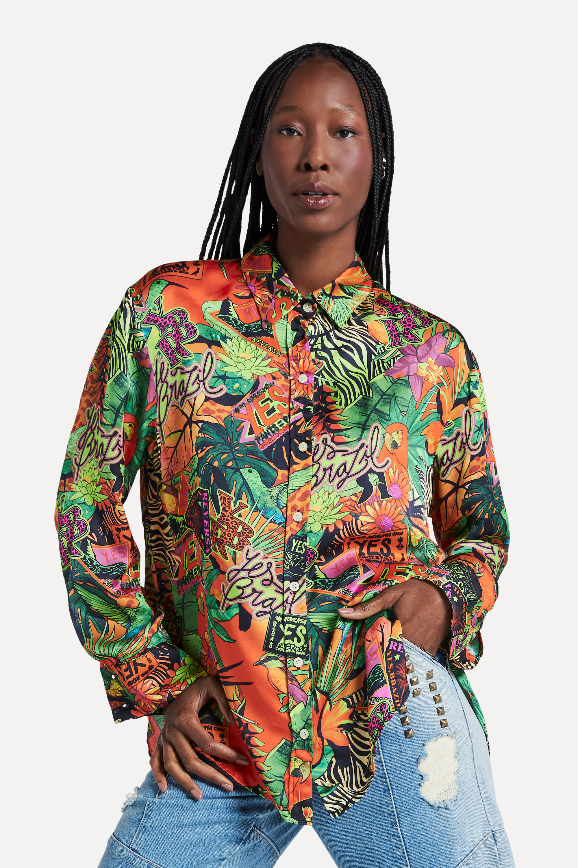 A Camisa Tropical Yes é confeccionada em tecido fluido e conta com estampa exclusiva. Possui modelagem soltinha e é perfeita para o uso urbano. Pode ser usada também como sobreposição e combina bem com uma calça, em momentos casuais. Camisa Estampada Reversa produzida eticamente no Brasil. Comprando esta peça, você viabiliza cinco pratos de comida através do nosso programa 1P5P. A modelo mede 1,78 m de altura e 82 cm de busto.