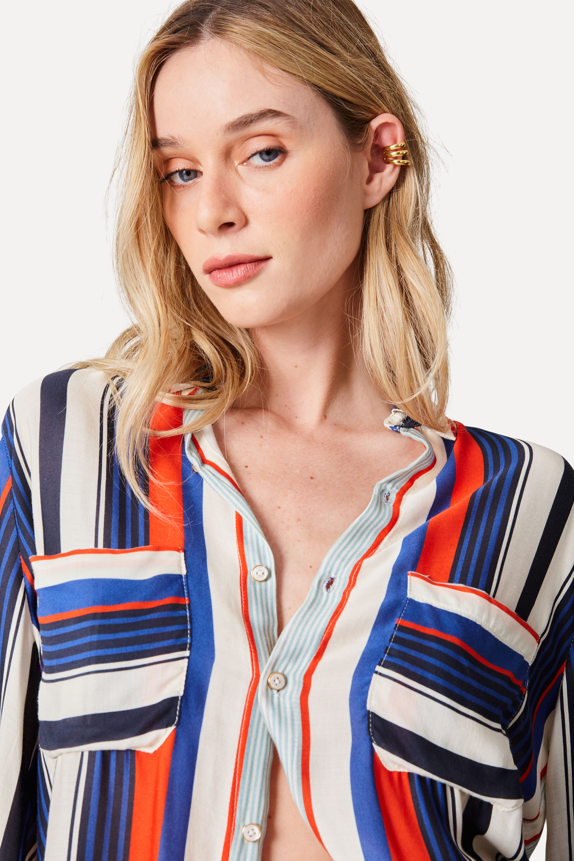 Para um dia de trabalho ou uma saída mais formal, aposte na Camisa Utilitaria Listra Navy! Com modelagem confortável e tecido leve, essa camisa possui manga longa, fechamento por botões e bolsinhos na região do busto. Combine com a Calca Pantalona Listra Navy ou o Short Listra Navy e tenha um look completo! A modelo tem 1,76 de altura, 85 de busto e veste 36. Comprando esta peça, você viabiliza cinco pratos de comida através do nosso Programa 1P5P. Camisa produzida eticamente no Brasil.