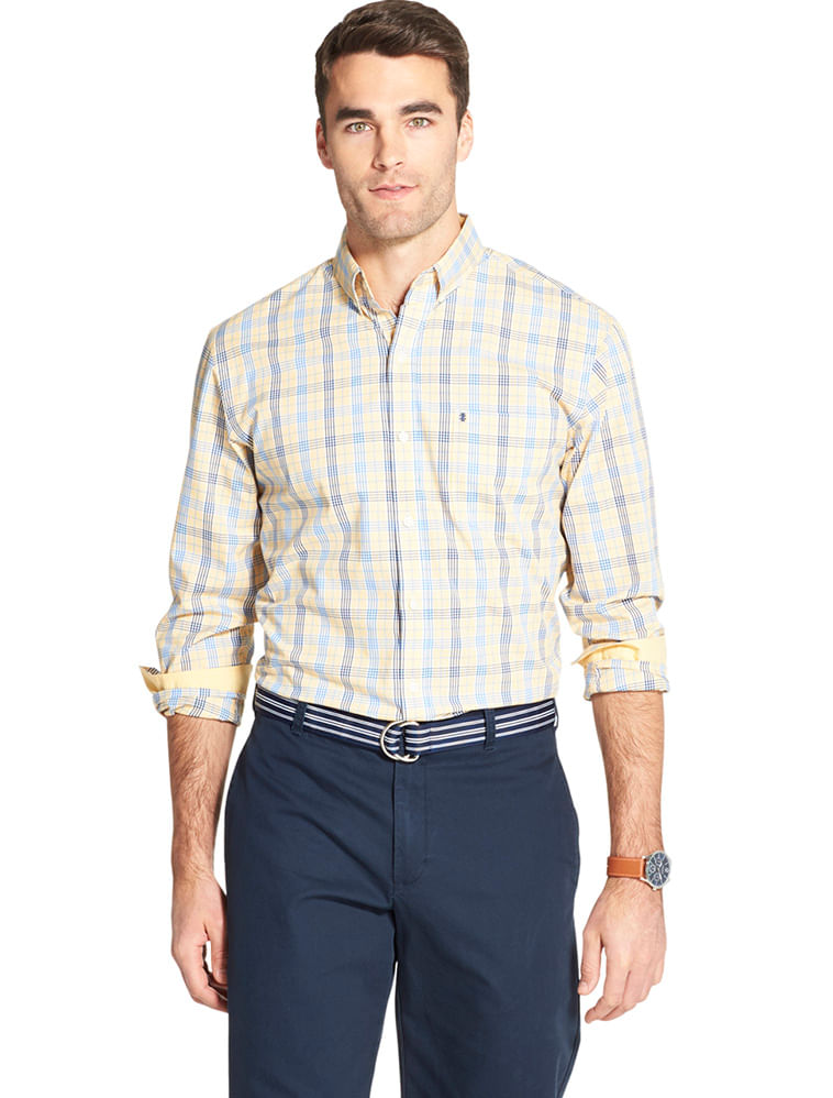 A camisa manga longa em xadrez amarelo e azul da IZOD tem uma modelagem regular, com um bolso chapado no peito , e com abotoamento button-down no colarinho O pé de gola e os punhos internos são em contraste .É uma camisa despojada , casual mas pode facilmente ser usada no dia a dia do trabalho . Em 100% algodão , e como toda fibra natural , a torna super confortável, respirável, fácil de lavar e secar .