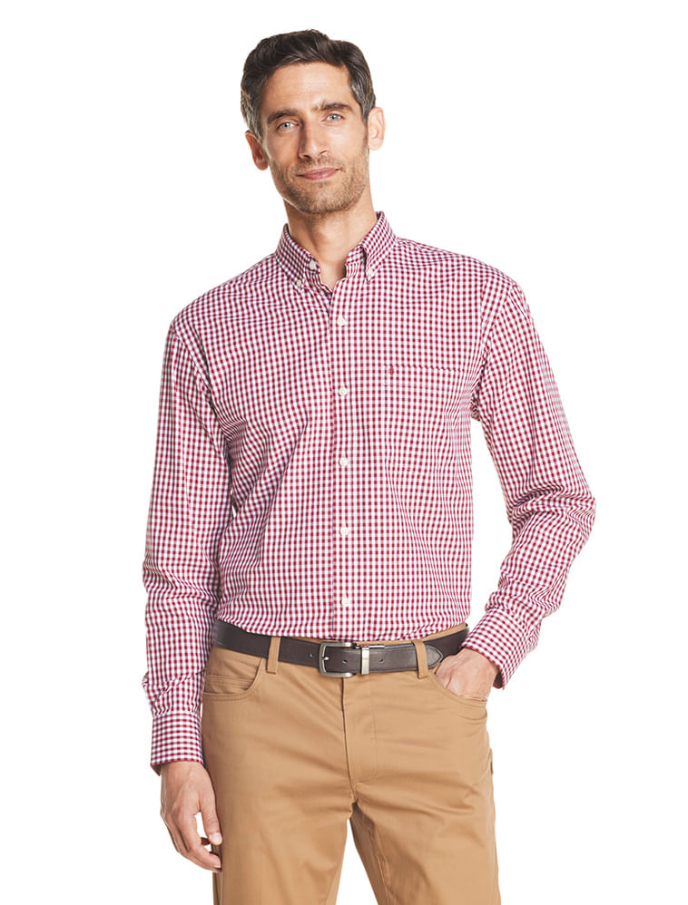 A camisa em xadrez tipo vichy manga longa em vermelho e branco da IZOD tem uma modelagem regular, com abotoamento button-down no colarinho é uma excelente opção para o dia dia de homens modernos e despojados. Tem um xadrez clássico e atemporal, mas numa coloração divertida e atual. É fabricada em 100% algodão , o que a torna super confortável, fácil de lavar e secar.