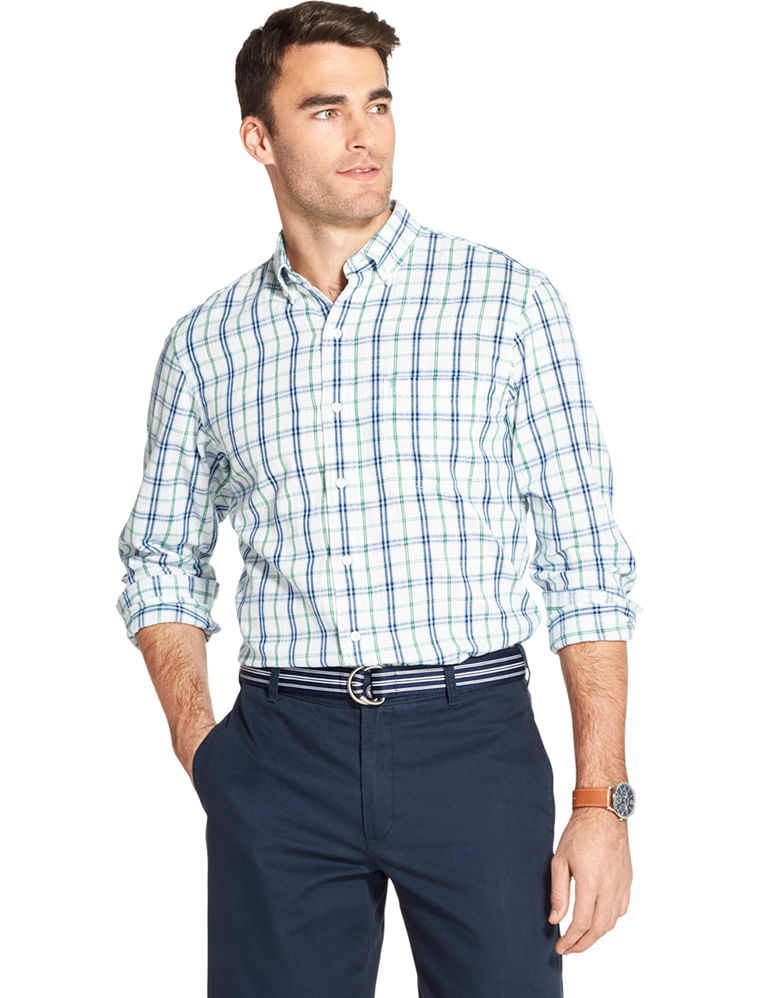 A camisa em xadrez manga longa em verde e azul com fundo branco da IZOD tem uma modelagem regular, com abotoamento button-down no colarinho é uma excelente opção para o dia dia de homens modernos e despojados. Em um xadrez clássico e atemporal e numa coloração que funciona bem no dia a dia do trabalho como também em looks mais casuais. É fabricada em 100% algodão , o que a torna super confortável, fácil de lavar e secar.