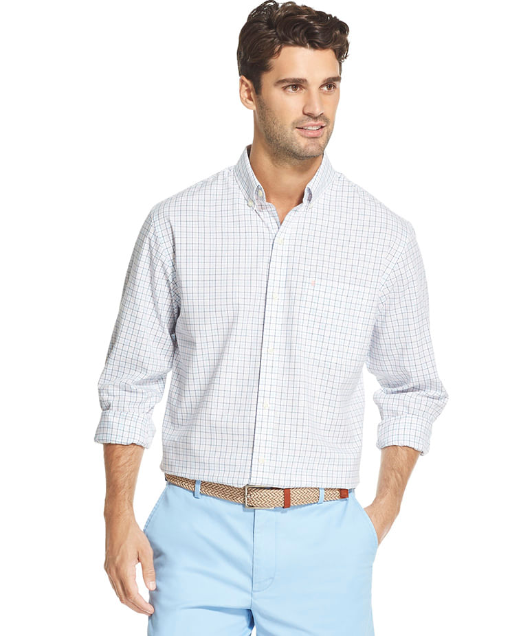 A camisa manga longa xadrez rosa claro e azul com fundo branco da IZOD tem uma modelagem regular, com um bolso chapado no peito , e com abotoamento button-down no colarinho . Tem o pé de gola e punhos internos em contraste. É uma peça fácil para a coordenar com looks para o dia a dia do trabalho e para os finais de semana .É fabricada em 100% algodão , e como toda fibra natural , a torna super confortável, respirável, fácil de lavar e secar .
