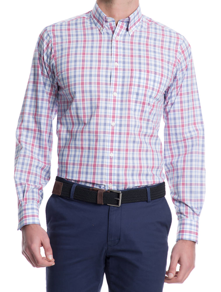 A camisa manga longa xadrez vermelho claro e azul da IZOD tem uma modelagem regular, com um bolso chapado no peito , e com abotoamento button-down no colarinho .uma camisa essencial para o homem moderno, e uma peça chave para o dia a dia do trabalho e para os finais de semana Faz parte do programa de atributos ALL OVER STRETCH , o que significa que sua composição mista proporciona liberdade nos movimentos e conforto. Muito facil de lavar e secar..