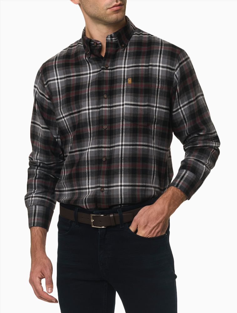 A camisa manga longa em flanela xadrez chumbo da IZOD tem uma modelagem regular, com um bolso chapado no peito , e com abotoamento button-down no colarinho .É uma camisa despojada , casual mas pode facilmente ser usada no dia a dia do trabalho. Para dias mais frios . Facil de lavar e secar .