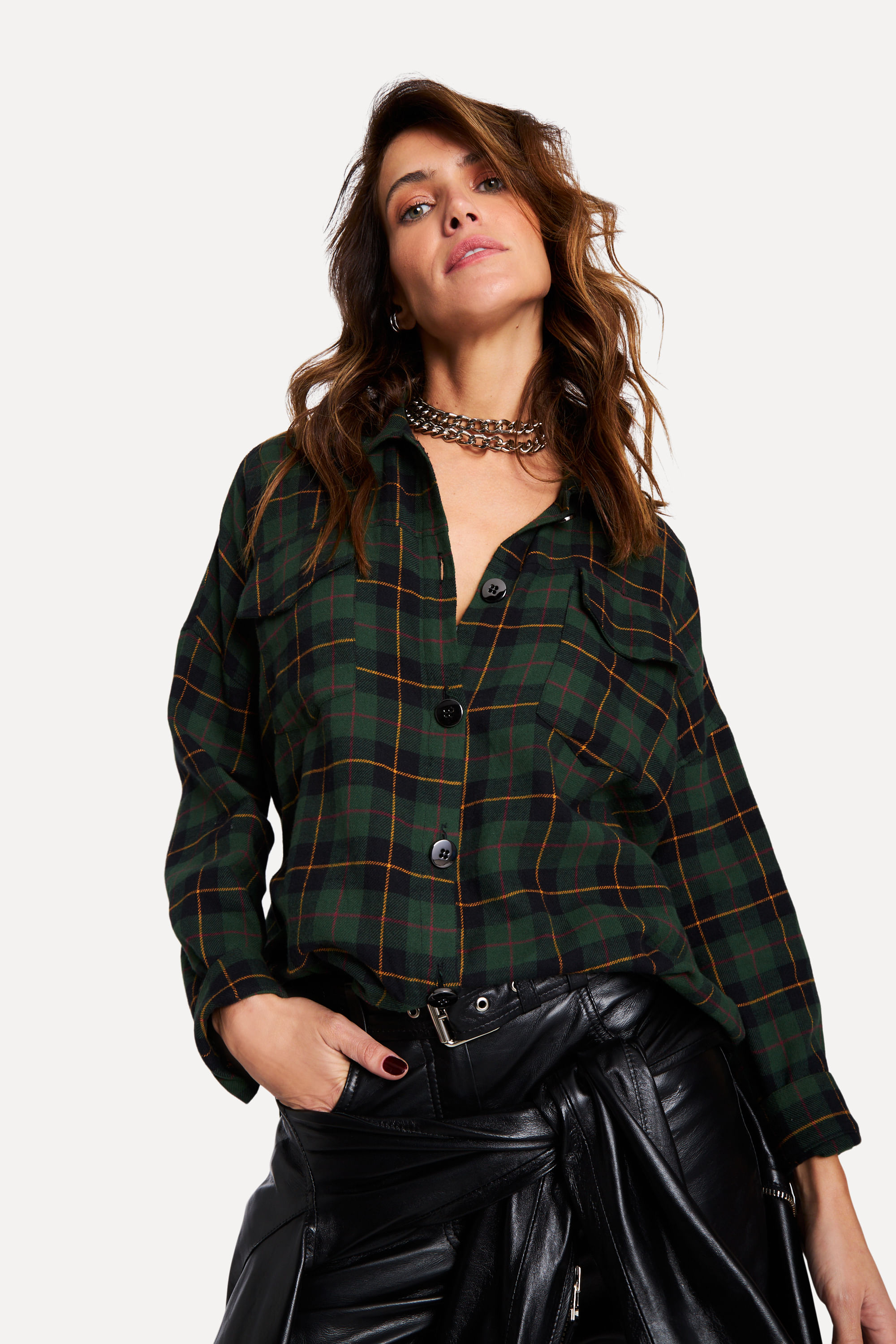 Peça curinga no seu closet! A camisa de algodão verde tem shape mais amplo e pode ser usada fechada, com calças de alfaiataria ou jeans, ou aberta, sobre tops e camisetas regata para um look casual e urbano.