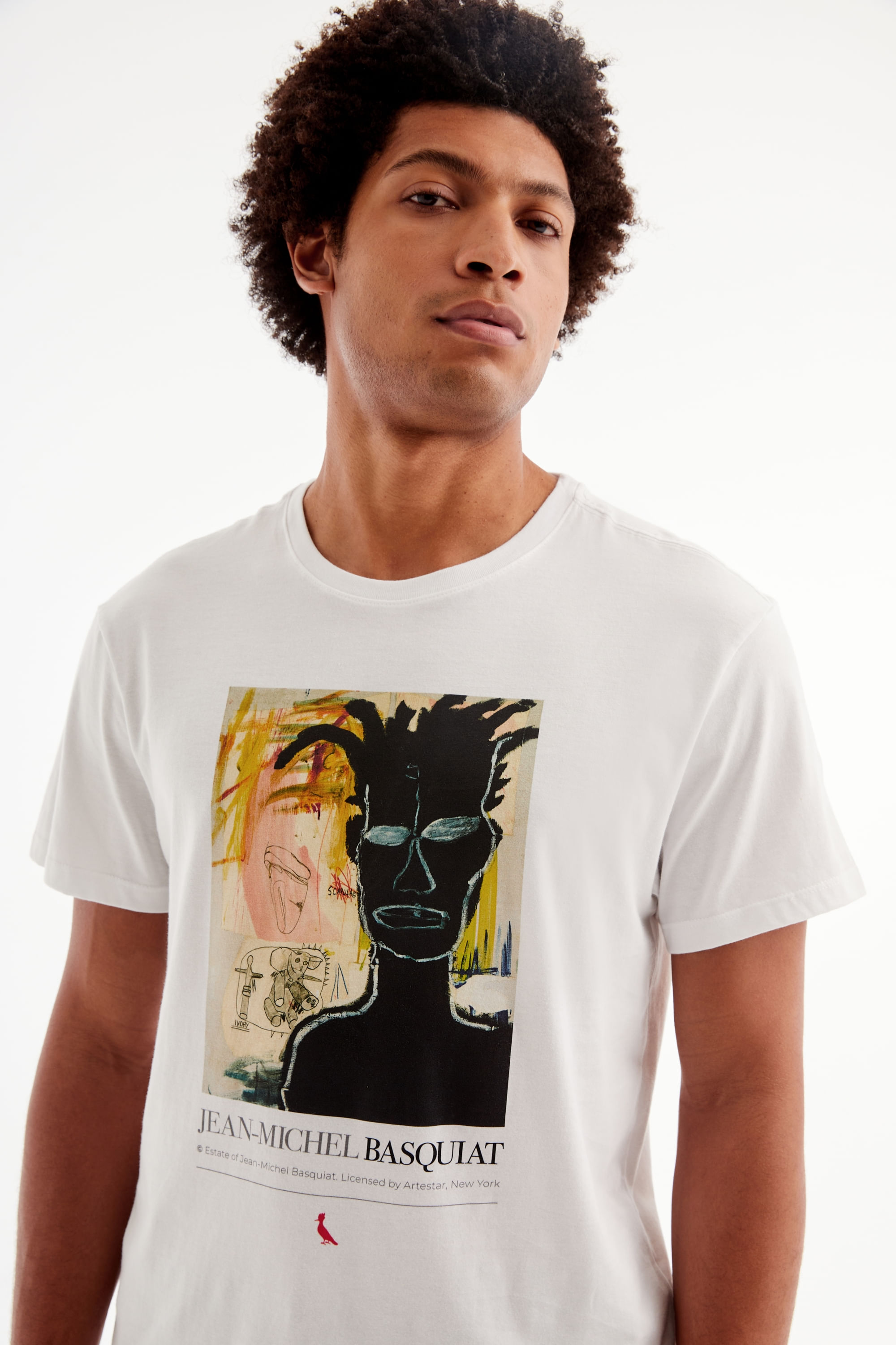 A Camiseta Basquiat Self Portrait traz Jean-Michel Basquiat retratado por si próprio. Neste autorretrato, o artista traduz em arte seus sentimentos sobre ser um jovem negro que cresceu lidando com as injustiças sociais que o cercavam em sua infância e adolescência. Apesar de ter sido um artista renomado, Basquiat nunca escapou das questões raciais que outros jovens de sua idade sofriam. Camiseta produzida eticamente no Brasil. Comprando esta peça, você viabiliza cinco pratos de comida através do nosso programa 1P5P. O modelo tem 1,84 m de altura, 99 cm de tórax e veste M.
