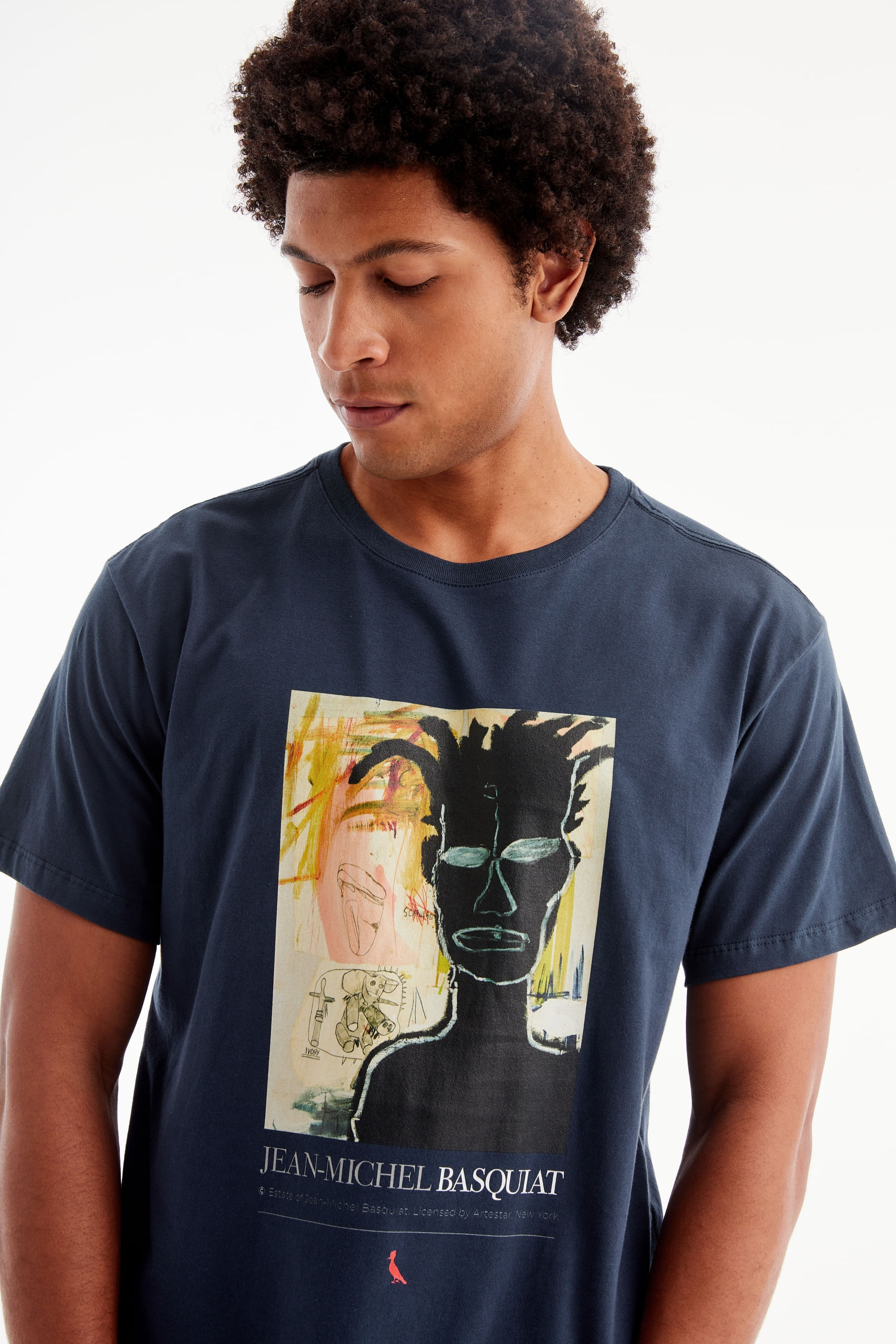 A Camiseta Basquiat Self Portrait traz Jean-Michel Basquiat retratado por si próprio. Neste autorretrato, o artista traduz em arte seus sentimentos sobre ser um jovem negro que cresceu lidando com as injustiças sociais que o cercavam em sua infância e adolescência. Apesar de ter sido um artista renomado, Basquiat nunca escapou das questões raciais que outros jovens de sua idade sofriam. Camiseta produzida eticamente no Brasil. Comprando esta peça, você viabiliza cinco pratos de comida através do nosso programa 1P5P. O modelo tem 1,84 m de altura, 99 cm de tórax e veste M.