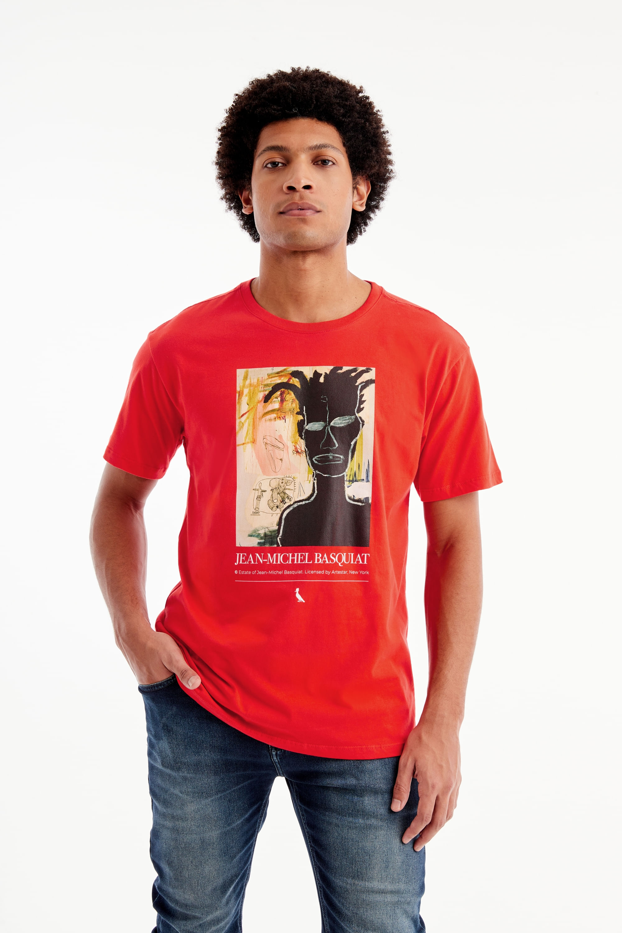 A Camiseta Basquiat Self Portrait traz Jean-Michel Basquiat retratado por si próprio. Neste autorretrato, o artista traduz em arte seus sentimentos sobre ser um jovem negro que cresceu lidando com as injustiças sociais que o cercavam em sua infância e adolescência. Apesar de ter sido um artista renomado, Basquiat nunca escapou das questões raciais que outros jovens de sua idade sofriam. Camiseta produzida eticamente no Brasil. Comprando esta peça, você viabiliza cinco pratos de comida através do nosso programa 1P5P. O modelo tem 1,84 m de altura, 99 cm de tórax e veste M.
