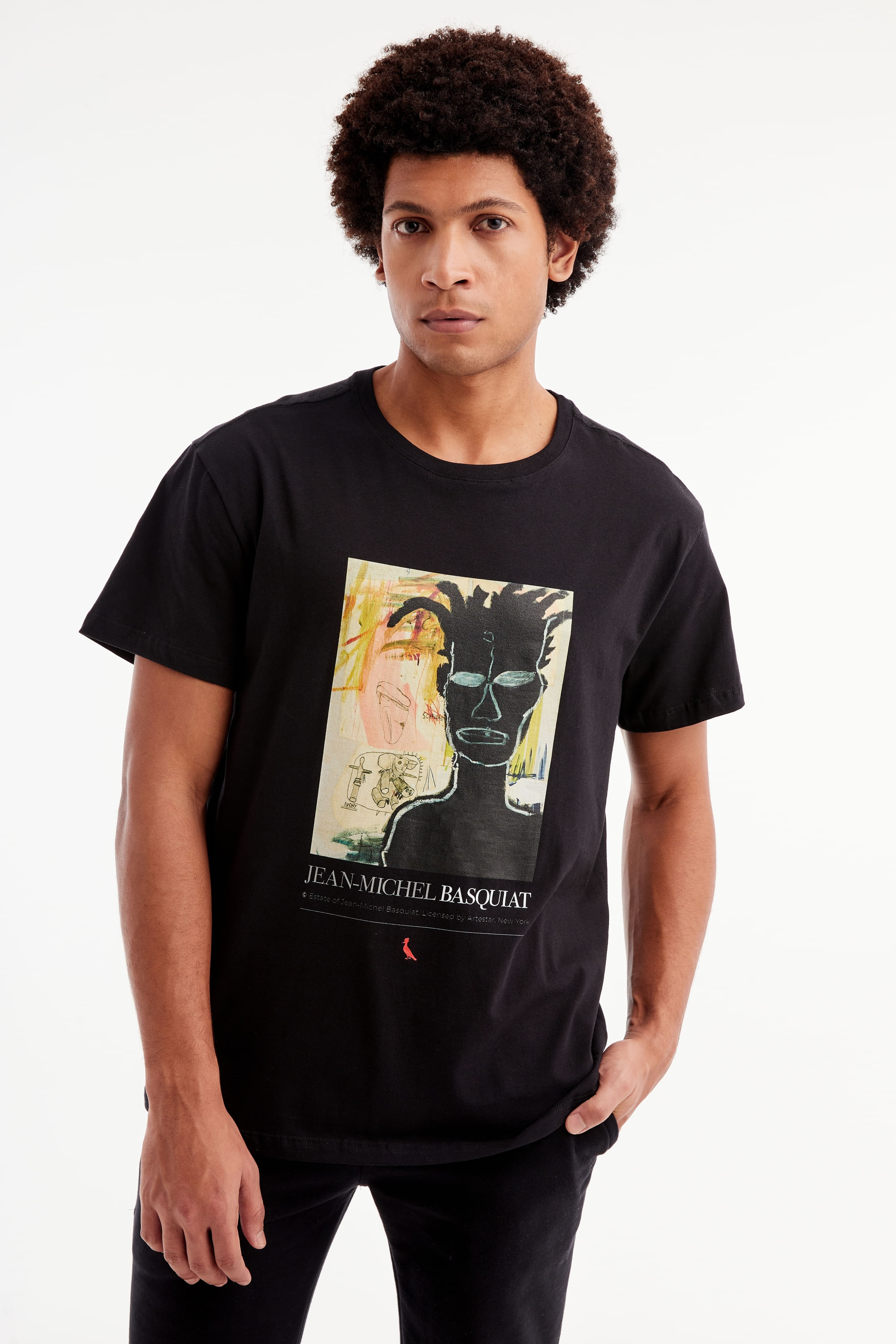 A Camiseta Basquiat Self Portrait traz Jean-Michel Basquiat retratado por si próprio. Neste autorretrato, o artista traduz em arte seus sentimentos sobre ser um jovem negro que cresceu lidando com as injustiças sociais que o cercavam em sua infância e adolescência. Apesar de ter sido um artista renomado, Basquiat nunca escapou das questões raciais que outros jovens de sua idade sofriam. Camiseta produzida eticamente no Brasil. Comprando esta peça, você viabiliza cinco pratos de comida através do nosso programa 1P5P. O modelo tem 1,84 m de altura, 99 cm de tórax e veste M.