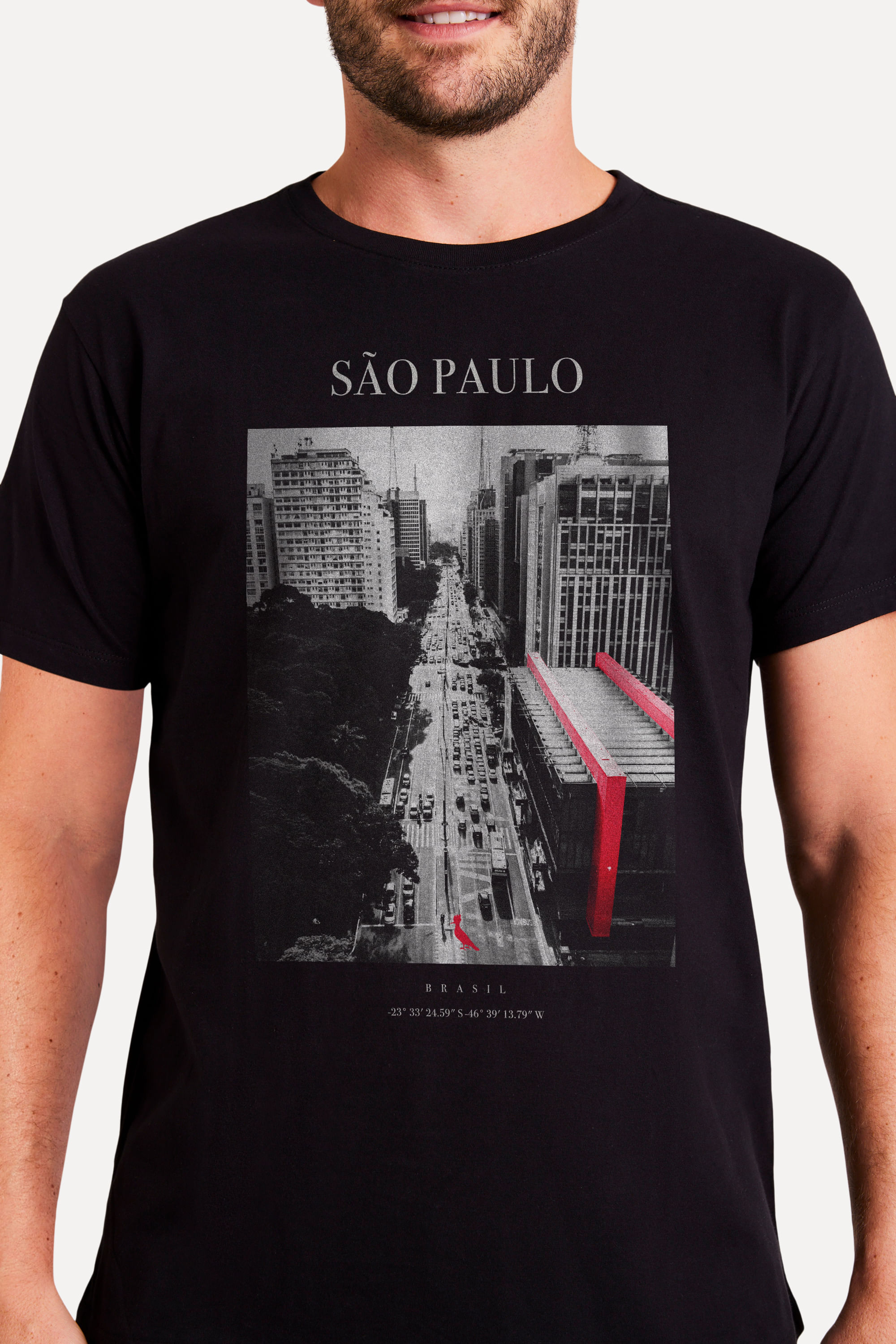 A Camiseta Cidade de São Paulo homenageia a avenida mais famosa do país: a Avenida Paulista. Sua estampa traz como destaque o MASP, única parte colorida, para harmonizar com o vermelho do clássico pica-pau da Reserva. Embaixo da estampa, as coordenadas da maior cidade do país. Use com bermuda ou calça jeans e esteja pronto para um rolê mais despojado. O modelo da cor branca tem 1,84 de altura, 103 de tórax e veste 42; o modelo da cor preta tem 1,84 de altura, 99 de tórax e veste 42. Comprando esta peça, você viabiliza cinco pratos de comida através do nosso Programa 1P5P. Camiseta produzida eticamente no Brasil.