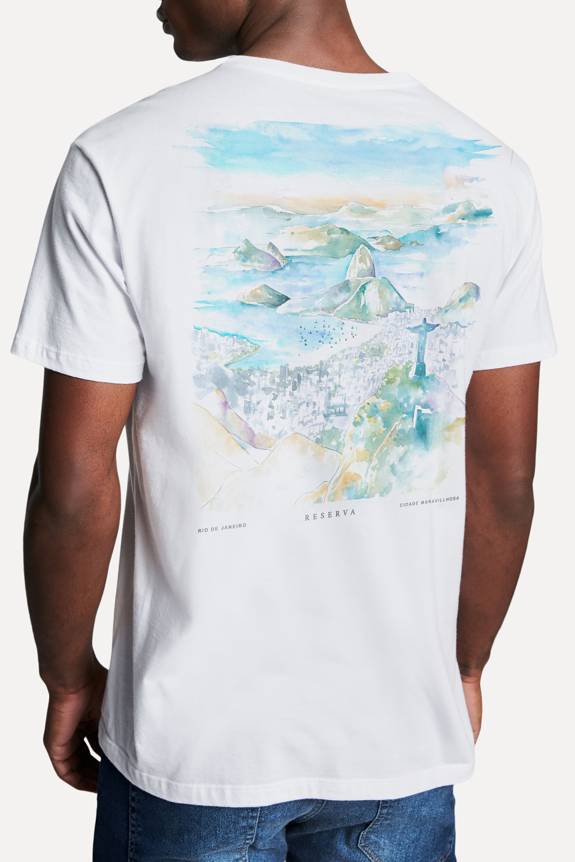 Camiseta produzida em algodão de alta qualidade, garantindo muito conforto e liberdade de movimentos. Possui manga curta, gola redonda em ribana e estampa exclusiva Reserva, que celebra as belezas do Rio de Janeiro. Para um rolé na orla da praia ou pro sambinha no fim de tarde, combina com calças ou bermudas, tênis ou chinelos. Comprando esta peça, você viabiliza cinco pratos de comida através do nosso Programa 1P5P. Camiseta produzida eticamente no Brasil.