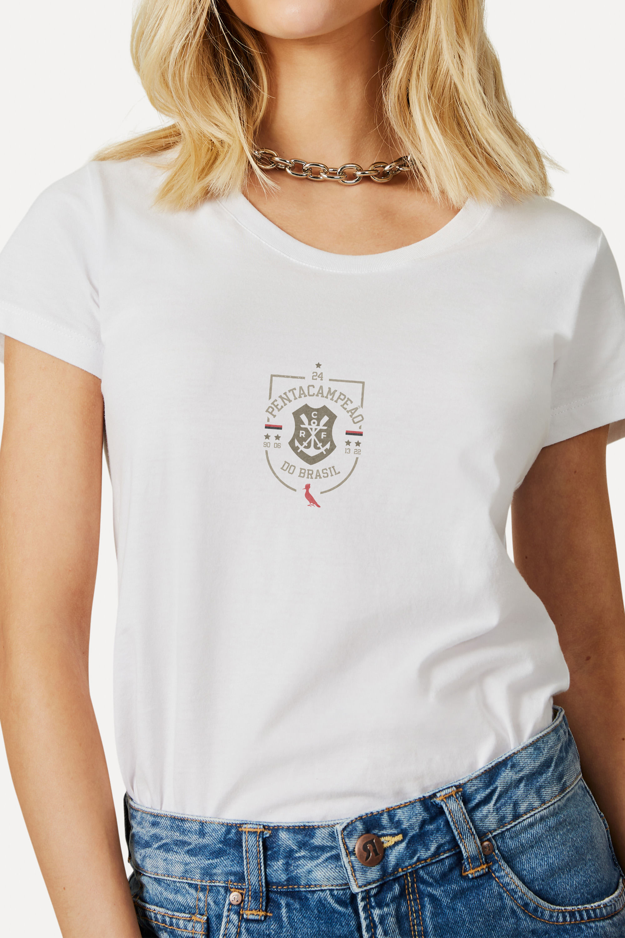 Comemora Nação, o Mengão é penta! A Camiseta Feminina Penta Do Brasil Flamengo é feita em algodão de alta qualidade, garantindo muito conforto e liberdade de movimentos. Possui manga curta e gola redonda. Centralizado, está o escudo da regata do Flamengo, junto com a frase Pentacampeão do Brasil e os anos das conquistas de 90, 06, 13, 22 e 24, este último em destaque. Combine com calças ou shorts, tênis ou sandálias. Comprando esta peça, você viabiliza cinco pratos de comida através do nosso Programa 1P5P. Camiseta produzida eticamente no Brasil.