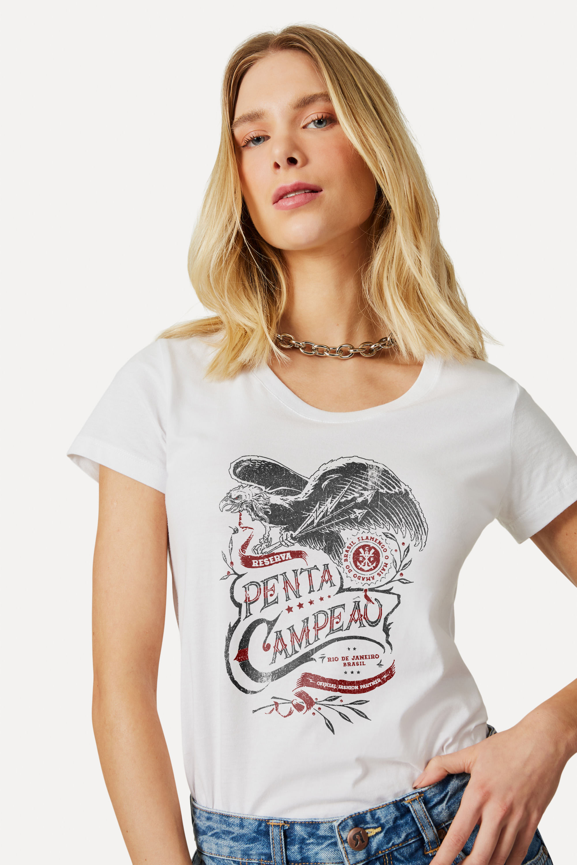 Comemora Nação, o Mengão é penta! A Camiseta Feminina Penta Campeão Flamengo é feita em algodão de alta qualidade, garantindo muito conforto e liberdade de movimentos. Possui manga curta e gola redonda em ribana. Centralizado, está estampada uma releitura do urubu, junto com a frase Pentacampeão e vários outros detalhes. Combine com calças ou shorts, tênis ou sandálias. Comprando esta peça, você viabiliza cinco pratos de comida através do nosso Programa 1P5P. Camiseta produzida eticamente no Brasil.