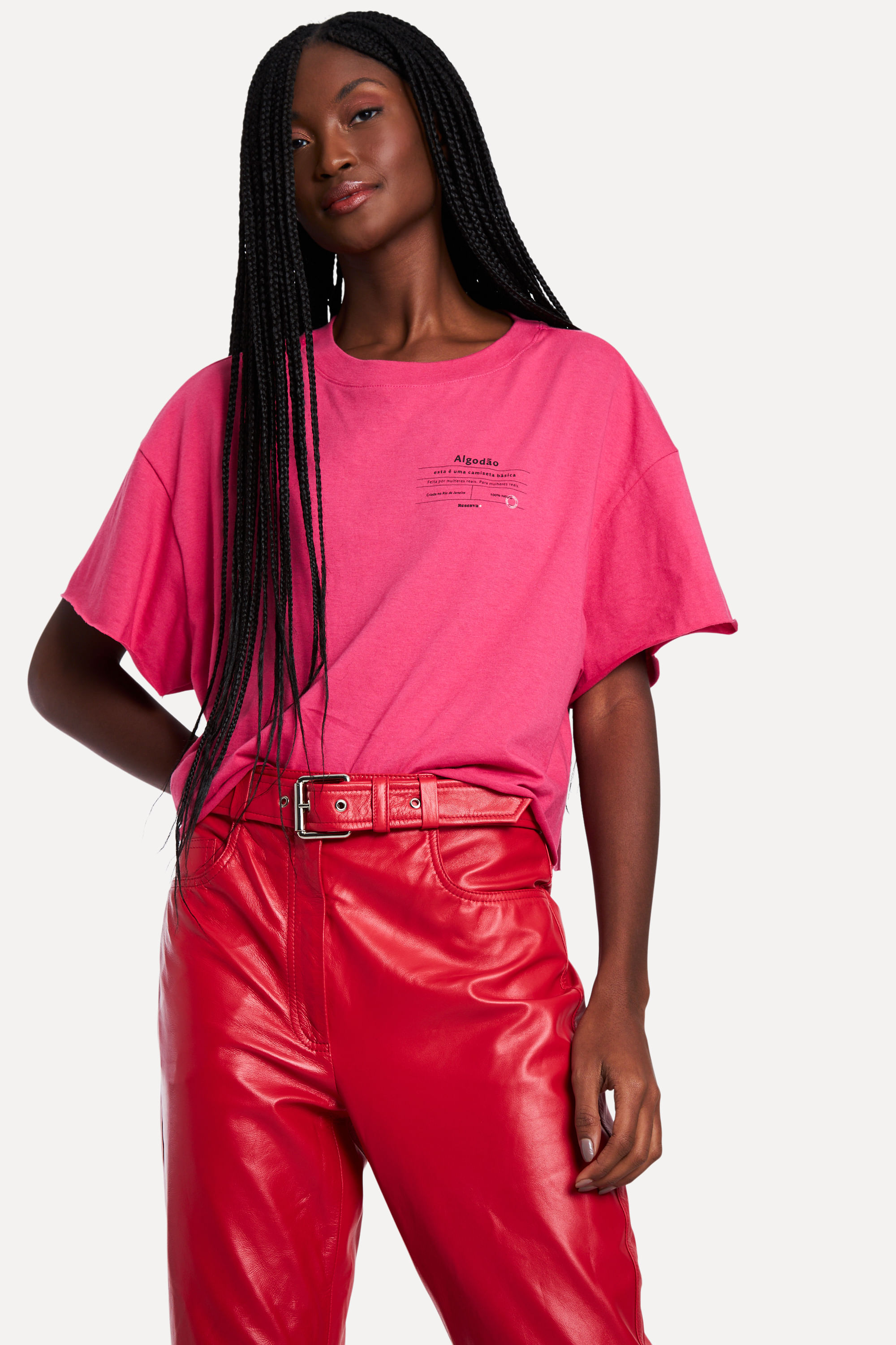 Sua nova favorita! A camiseta de algodão branca estampada cropped tem shape mais quadradinho. Use com calças de cintura alta para criar looks casuais e cool.