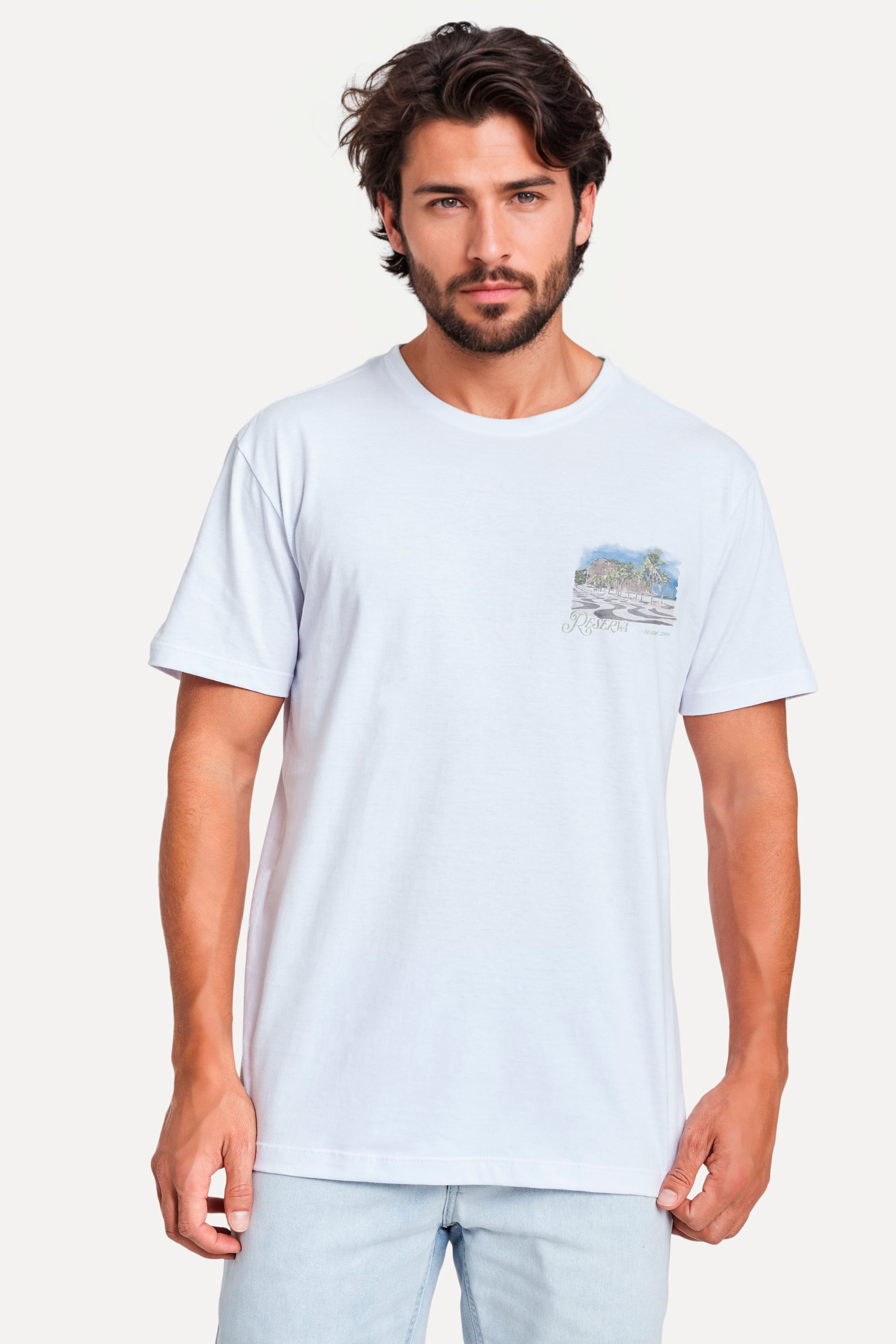 Camiseta produzida em algodão de alta qualidade, garantindo muito conforto e liberdade de movimentos. Possui manga curta, gola redonda em ribana e estampa exclusiva Reserva, que celebra as belezas do Rio de Janeiro. Para um rolé na orla da praia ou pro sambinha no fim de tarde, combina com calças ou bermudas, tênis ou chinelos. Comprando esta peça, você viabiliza cinco pratos de comida através do nosso Programa 1P5P. Camiseta produzida eticamente no Brasil.