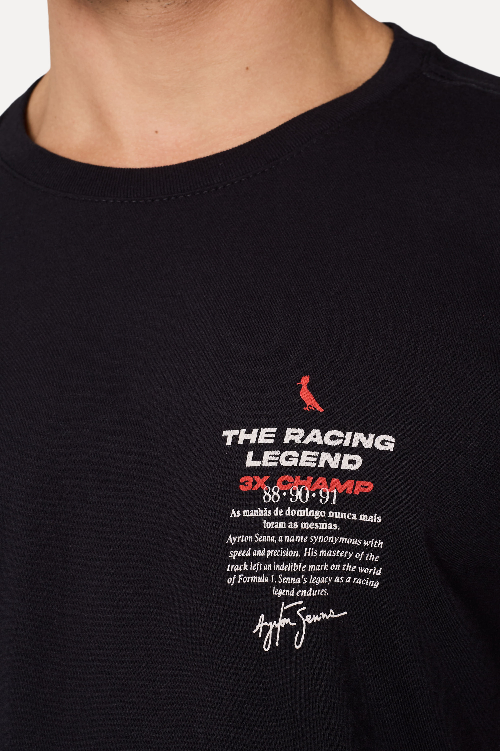 Das manhãs de domingo para a eternidade! Conheça a Camiseta Estampada Collabe Senna, feita para os fãs de um dos maiores pilotos de Fórmula 1 da história. Feita em malha 100% algodão, manga curta, gola redonda de ribana de algodão e modelagem regular, que oferece caimento reto no corpo. Sua estampa no peito é a assinatura da collab com Senna, junto ao nosso pica-pau vermelho. Disponível em 3 cores, escolha qual combina mais com seu estilo. Combine com calças ou bermudas, tênis ou chinelos e acelere! O modelo tem 1,85 de altura, 103 de tórax e veste 40. Comprando esta peça, você viabiliza cinco pratos de comida através do nosso Programa 1P5P. Camiseta produzida eticamente no Brasil.