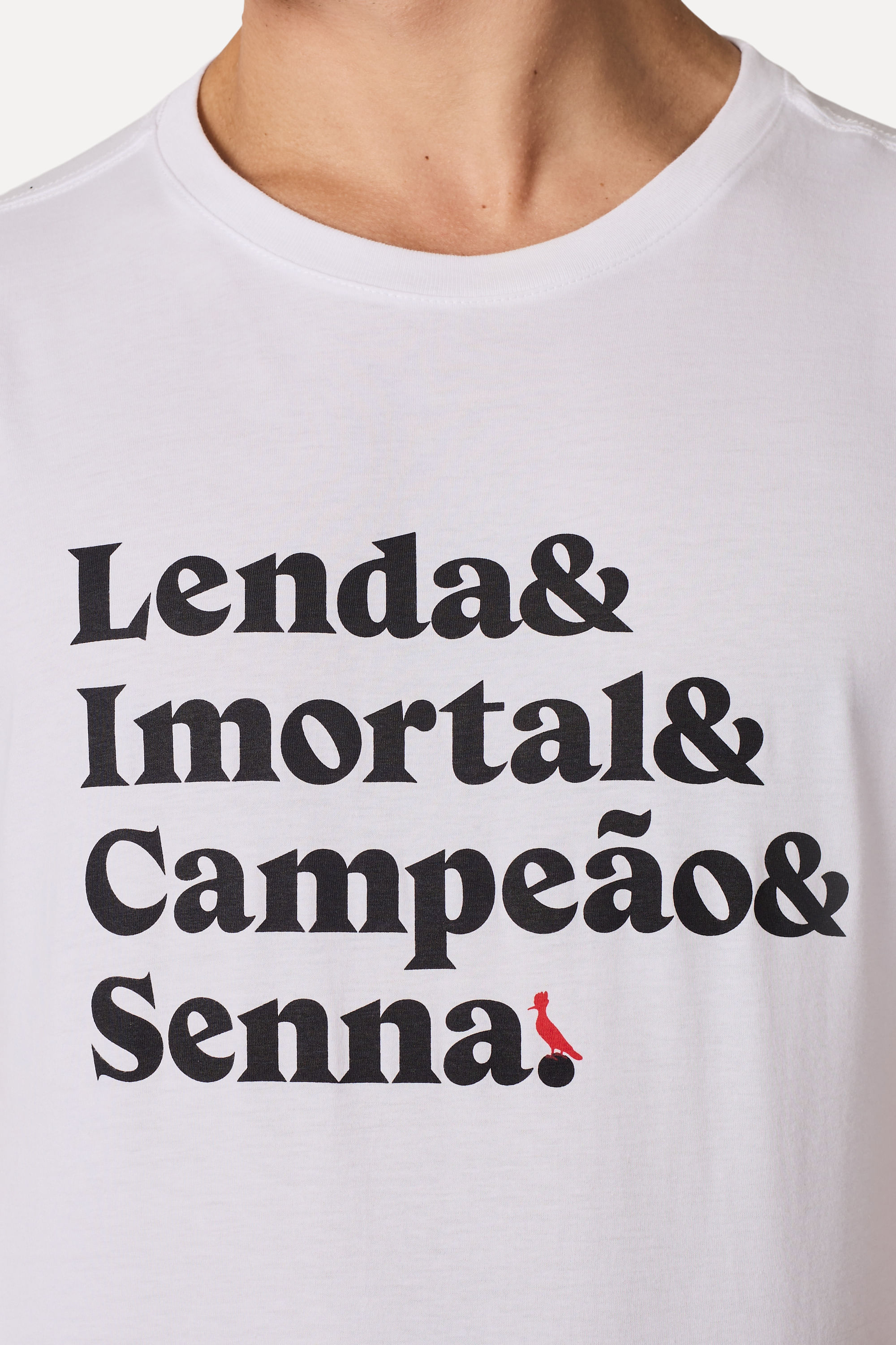 Das manhãs de domingo para a eternidade! Conheça a Camiseta Estampada &&& Senna, feita para os fãs de um dos maiores pilotos de Fórmula 1 da história. Feita em malha 100% algodão, manga curta, gola redonda de ribana de algodão e modelagem regular, que oferece caimento reto no corpo. Sua estampa traz a frase “Lenda & Imortal & Campeão & Senna”, acompanhada do nosso pica-pau vermelho. Disponível em 2 cores, escolha qual combina mais com seu estilo. Combine com calças ou bermudas, tênis ou chinelos e acelere! O modelo tem 1,85 de altura, 103 de tórax e veste 40. Comprando esta peça, você viabiliza cinco pratos de comida através do nosso Programa 1P5P. Camiseta produzida eticamente no Brasil.