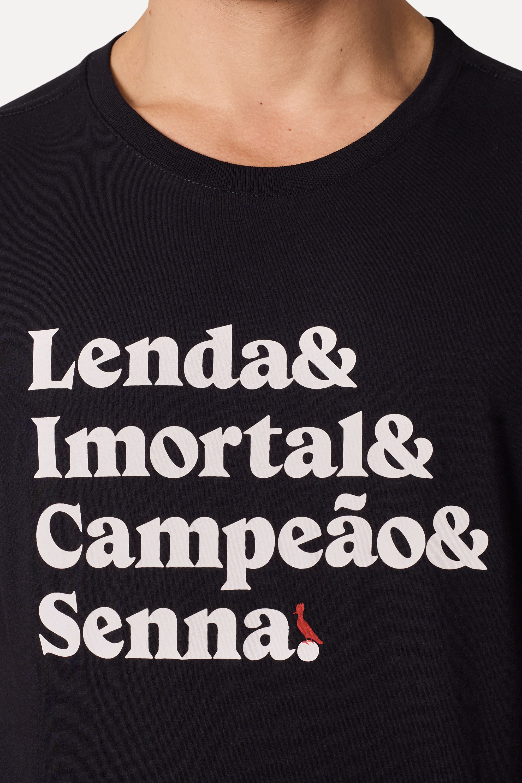Das manhãs de domingo para a eternidade! Conheça a Camiseta Estampada &&& Senna, feita para os fãs de um dos maiores pilotos de Fórmula 1 da história. Feita em malha 100% algodão, manga curta, gola redonda de ribana de algodão e modelagem regular, que oferece caimento reto no corpo. Sua estampa traz a frase “Lenda & Imortal & Campeão & Senna”, acompanhada do nosso pica-pau vermelho. Disponível em 2 cores, escolha qual combina mais com seu estilo. Combine com calças ou bermudas, tênis ou chinelos e acelere! O modelo tem 1,85 de altura, 103 de tórax e veste 40. Comprando esta peça, você viabiliza cinco pratos de comida através do nosso Programa 1P5P. Camiseta produzida eticamente no Brasil.