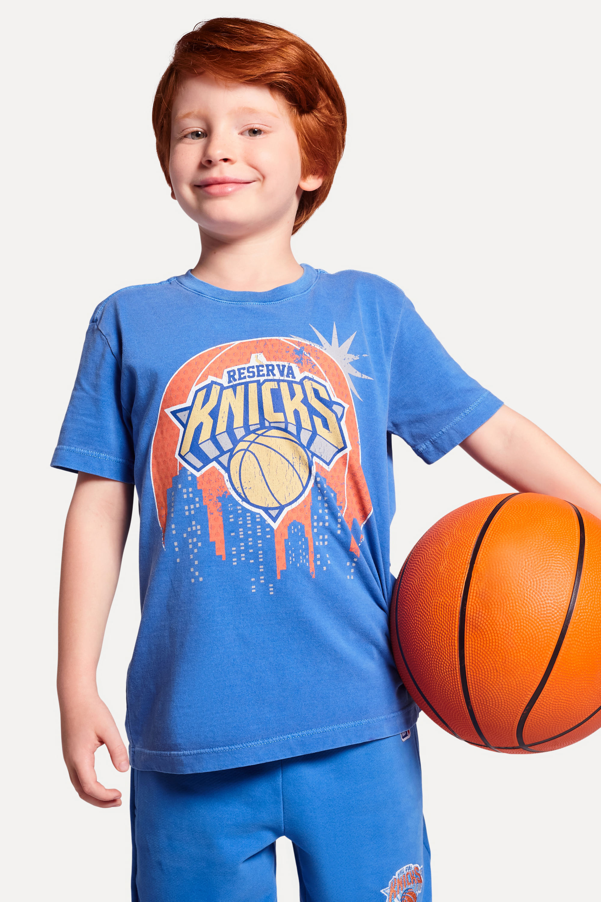 Feita de algodão com detalhe estonado, possui modelagem regular e estampa frontal do clássico escudo dos Knicks. Ideal para os Minis mais descolados e amantes do esporte. Produzido eticamente no Brasil. Comprando esta peça, você complementa cinco pratos de comida através do nosso programa 1P=5P.